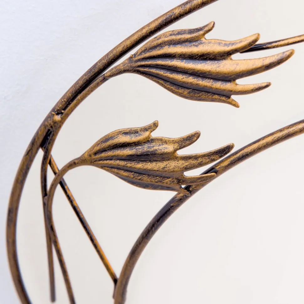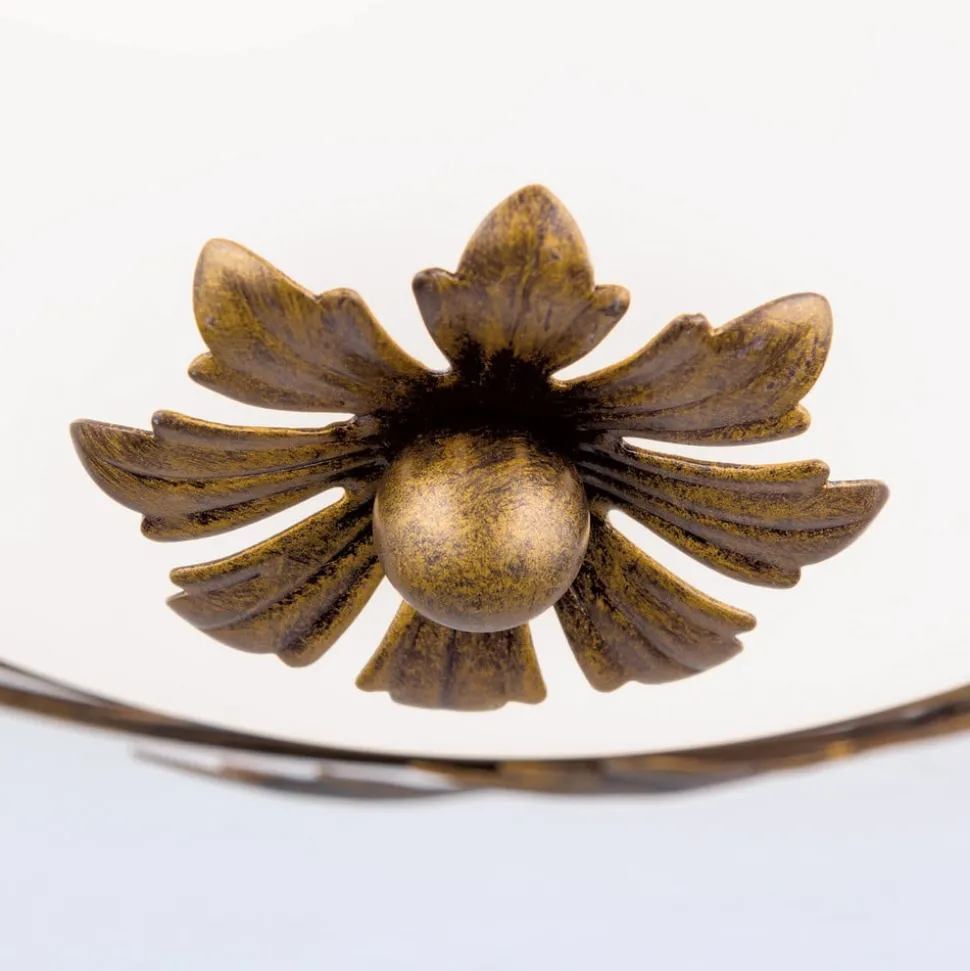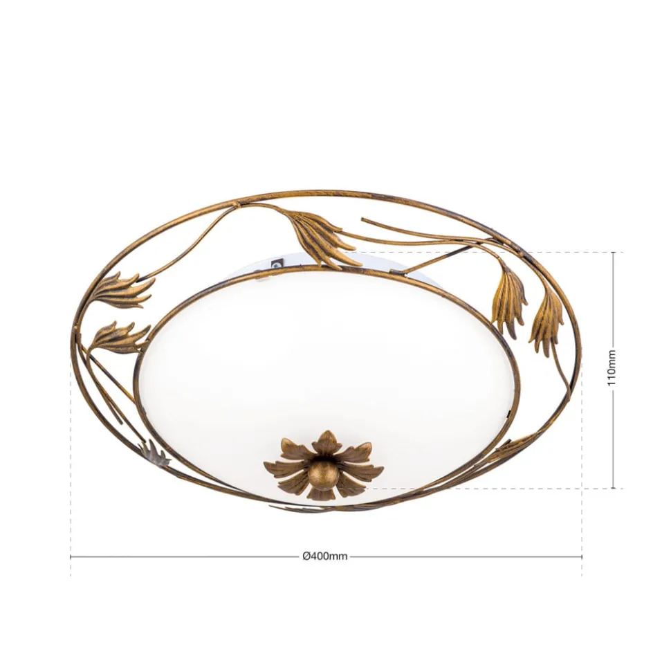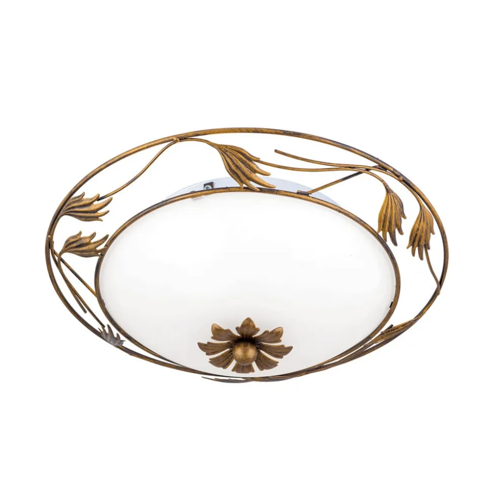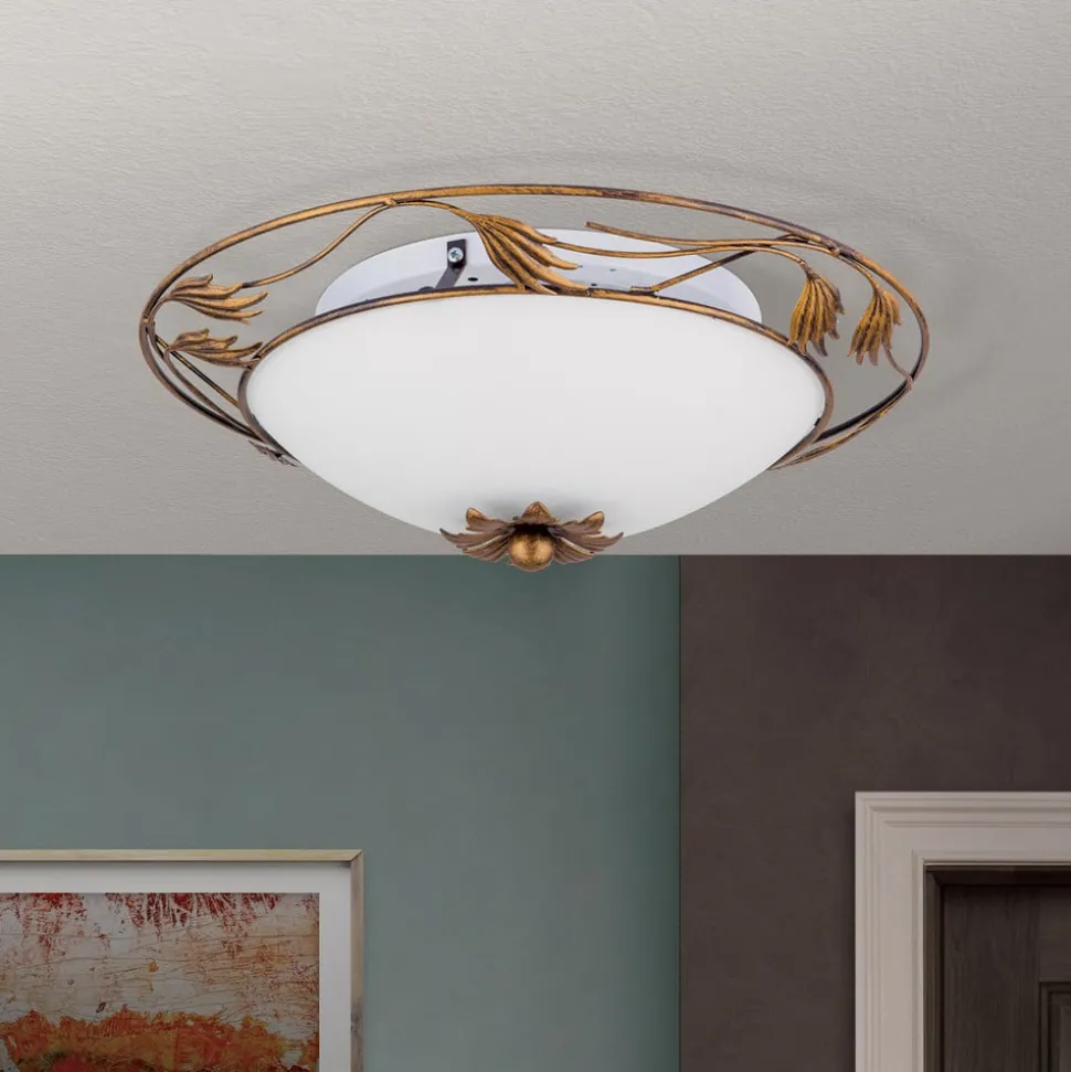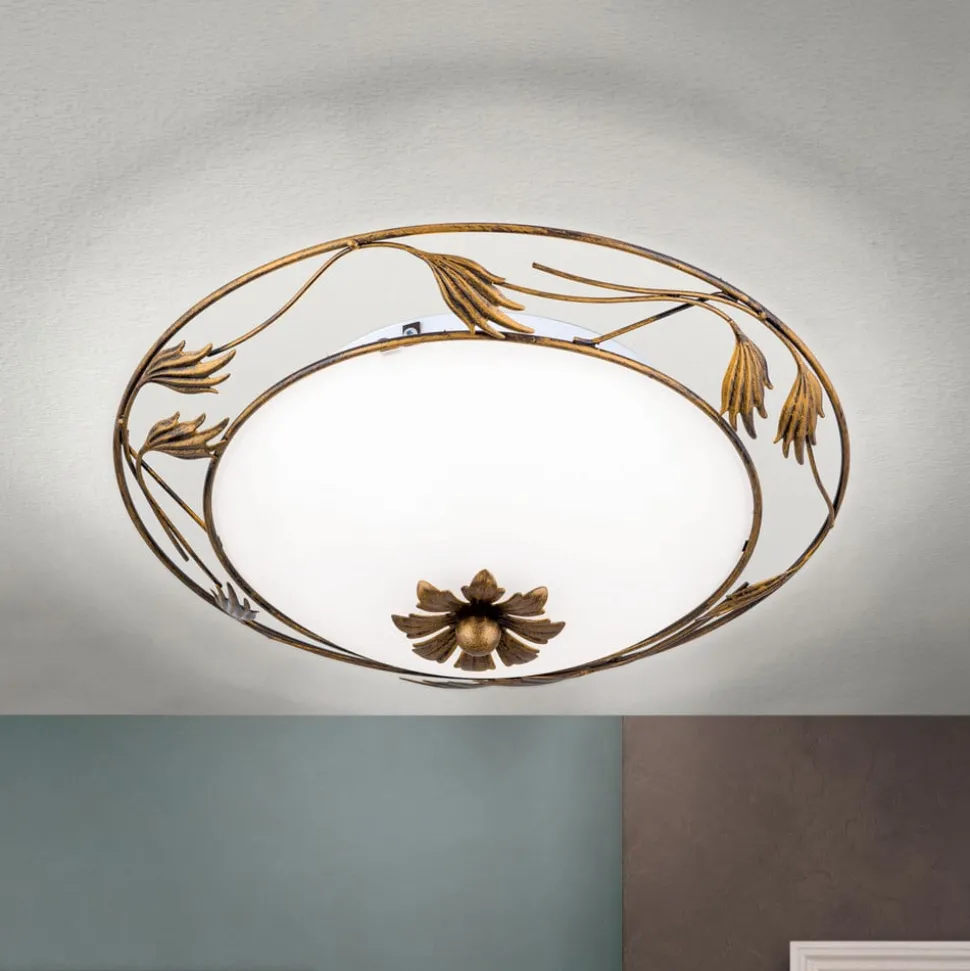 Florale plafondlamp Fleur in landelijke stijl met satijnglas voor gezellig lichtBloemrijk smeedijzerwerk op het frame in antiekgouden afwerking en een satijnglas maken de ronde plafondlamp Fleur tot een aantrekkelijke blikvanger. Ze siert verschillende interieurstijlen van mediterraan tot klassiek en zorgt voor gelijkmatig licht voor een aangename sfeer.Opmerking: De armatuur is niet geschikt voor montage op houten plafonds of andere plafonds van brandbare materialen.