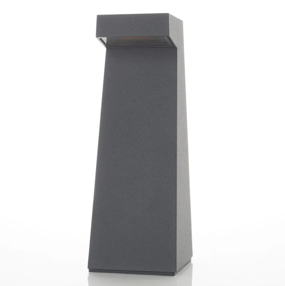 De grafietgrijze LED-voetlamp 77276/84108 van BEGA verlicht paden en ingangen dicht bij de grond. De modern vormgegeven behuizing is gemaakt van aluminium en roestvrij staal, de diffusor is gemaakt van veiligheidsglas. De armatuur is aan de bovenzijde afgeschermd, zodat het licht alleen naar beneden kan ontsnappen en zo een gelijkmatige en niet-verblindende verlichting van paden en terrassen wordt gegarandeerd. De armatuur wordt in de grond gefixeerd door middel van een grondstuk (incl.) van thermisch verzinkt staal.