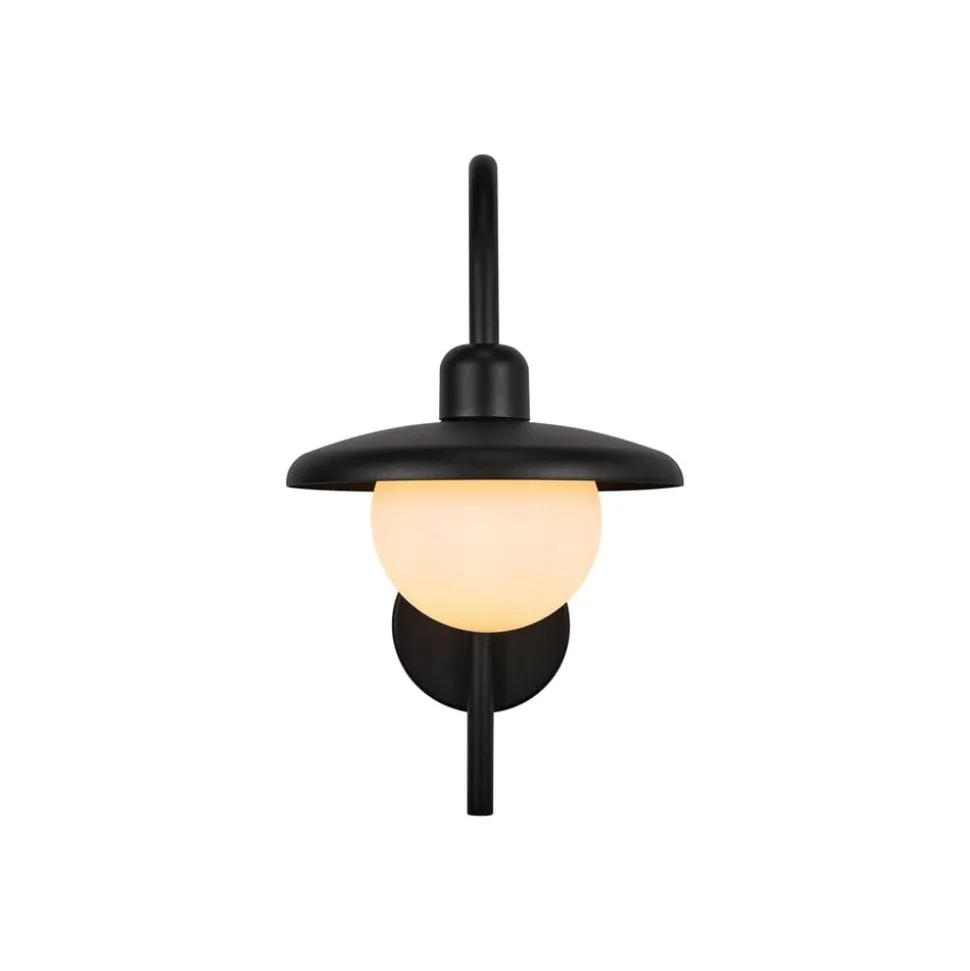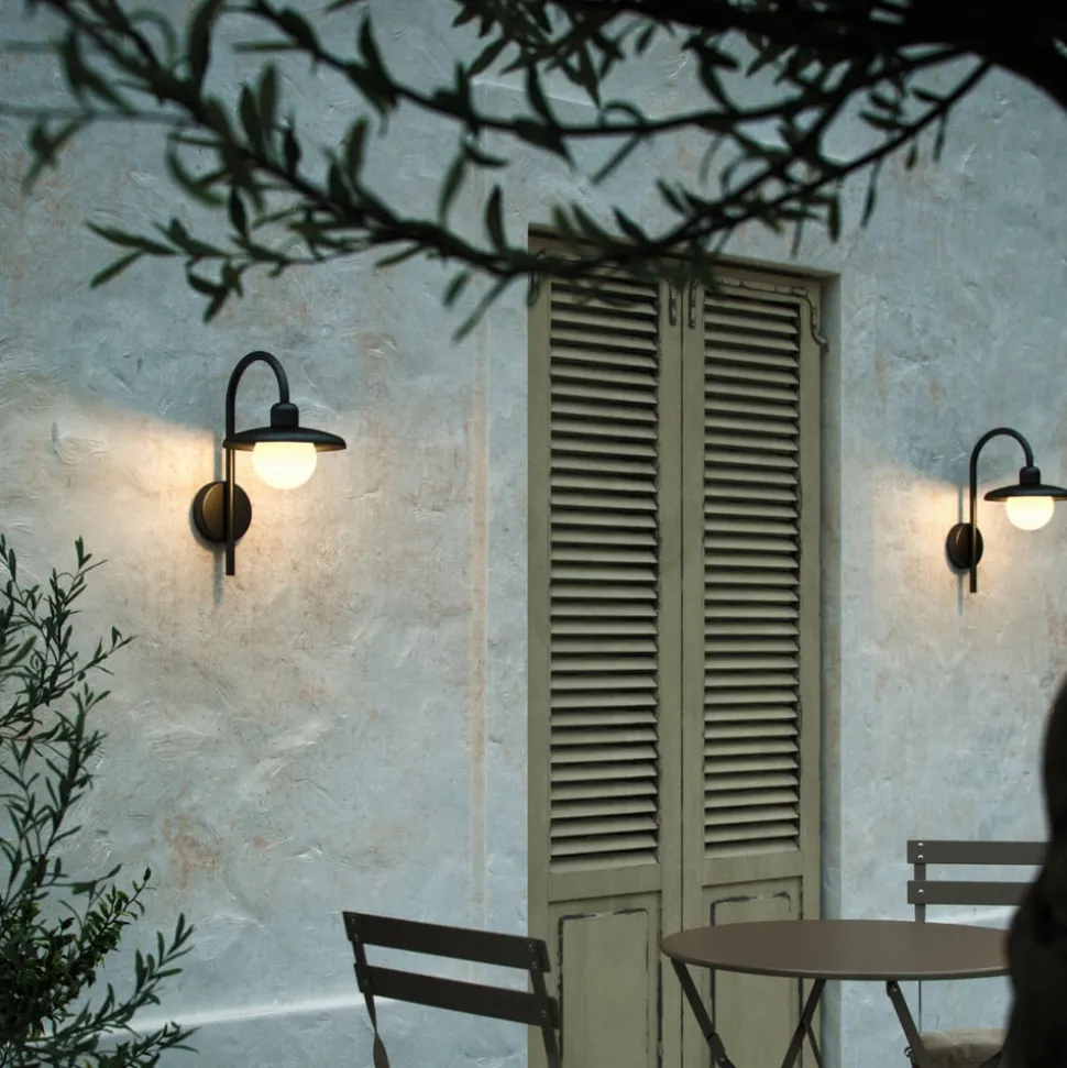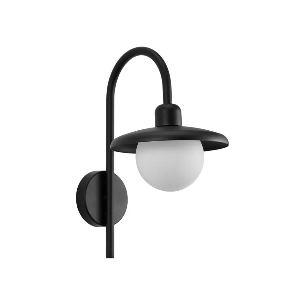 Berlo buitenwandlamp met gebogen arm en dubbele kap De Berlo buitenwandlamp bestaat uit een ronde muurbeugel met een gebogen arm die de kap aan het uiteinde vasthoudt. Deze bestaat uit een zwarte, wijd open metalen kap en een bol van opaalwit plastic, die als een diffuser werkt en het licht in alle richtingen uitstraalt zonder te verblinden. De lamp (E27) wordt niet meegeleverd – Parallelle aansluiting mogelijk