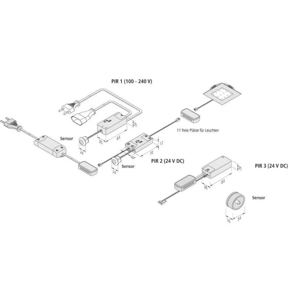 Deze mini PIR-bewegingssensor wordt gebruikt om armaturen of ballasten/transformatoren met een eurostekker te schakelen. Het sensorgedeelte wordt bijvoorbeeld in een meubel gemonteerd in een montagegat met Ø 2 cm, de andere componenten worden aan de achterkant opgeborgen. De stroom wordt geleverd via een stopcontact van 230 V.