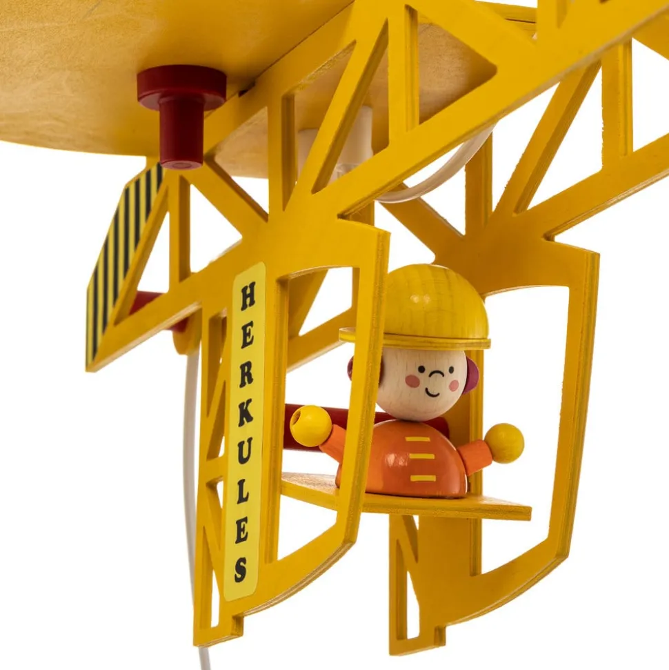 Bodo plafondlamp van hout in een speelse kraanvogelvorm Die kindvriendelijke Bodo plafondlamp in de vorm van een kraanvogel is de ideale lichtbron voor kleine bouwvakkers. De speelse look en het kleurrijke ontwerp maken het een bijzondere blikvanger in elke kinderkamer. Speciale aandacht is ook besteed aan de twee lichtbronnen zelf, die aan de voor- en achterkant in de vorm van E27 lampen aan de kraansteiger hangen. Die zorgen niet alleen voor voldoende licht, maar ook voor een bijzonder originele look.