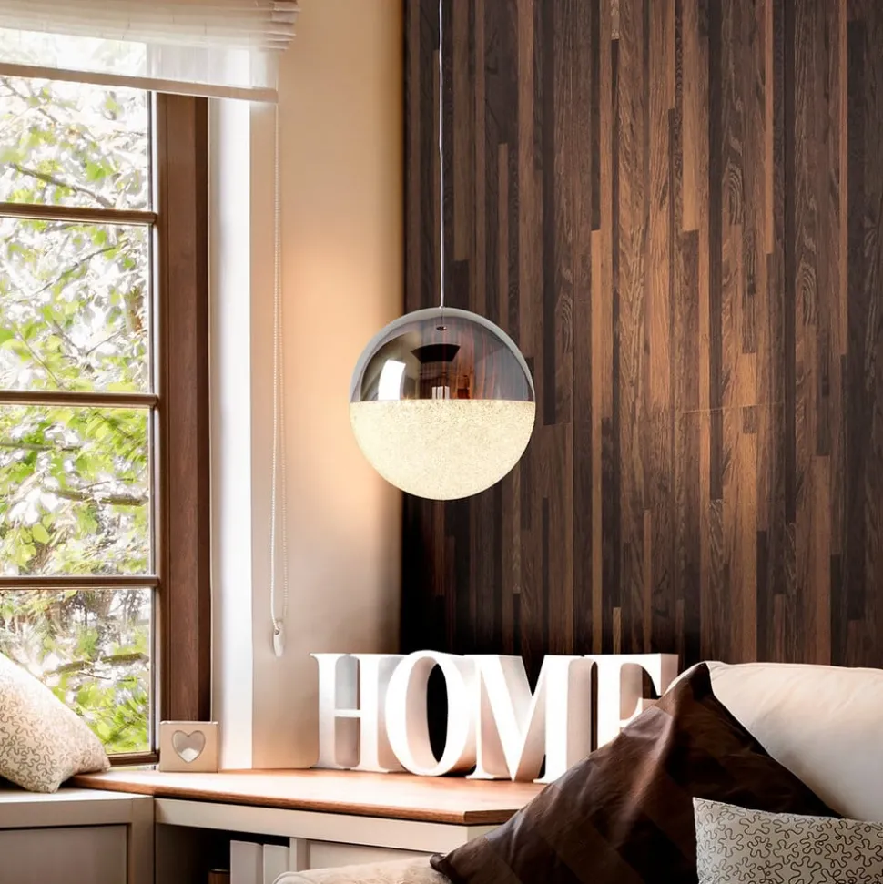Bolvormige LED hanglamp Sphere met tweedelige kap De bolvormige kap van de LED hanglamp Sphere is gemaakt van verchroomd metaal in de bovenste helft en polycarbonaat in de onderste helft, dat glad is aan de buitenkant en een speciale textuur heeft innes. Het licht van de warmwitte LED’s spot door het onderste gedeelte met een glinsterend effect en verlicht bijvoorbeeld een bijzettafel in de zithoek in de woonkamer zeer effectief en ook zeer energiezuinig.
