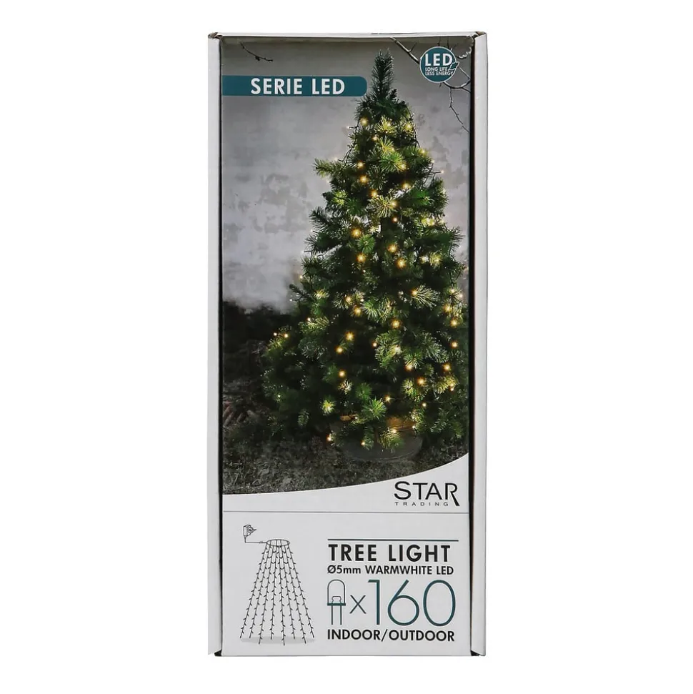 160-strengs Treelight LED boomgordijn Dit uitgebreid bewerkte boomgordijn met warmwitte LED-verlichting is geschikt voor montage aan bomen met een hoogte van 180 tot 200 cm. De 160 LED’s zijn verdeeld over acht strengen en zorgen voor een perfecte verlichting rondom. Treelight is voorzien van spatwaterbescherming (IP44) en is daarom bij uitstek geschikt voor buitenruimtes zoals tuinen, balkons of terrassen. Vijf meter voedingskabel met transformator wordt meegeleverd
