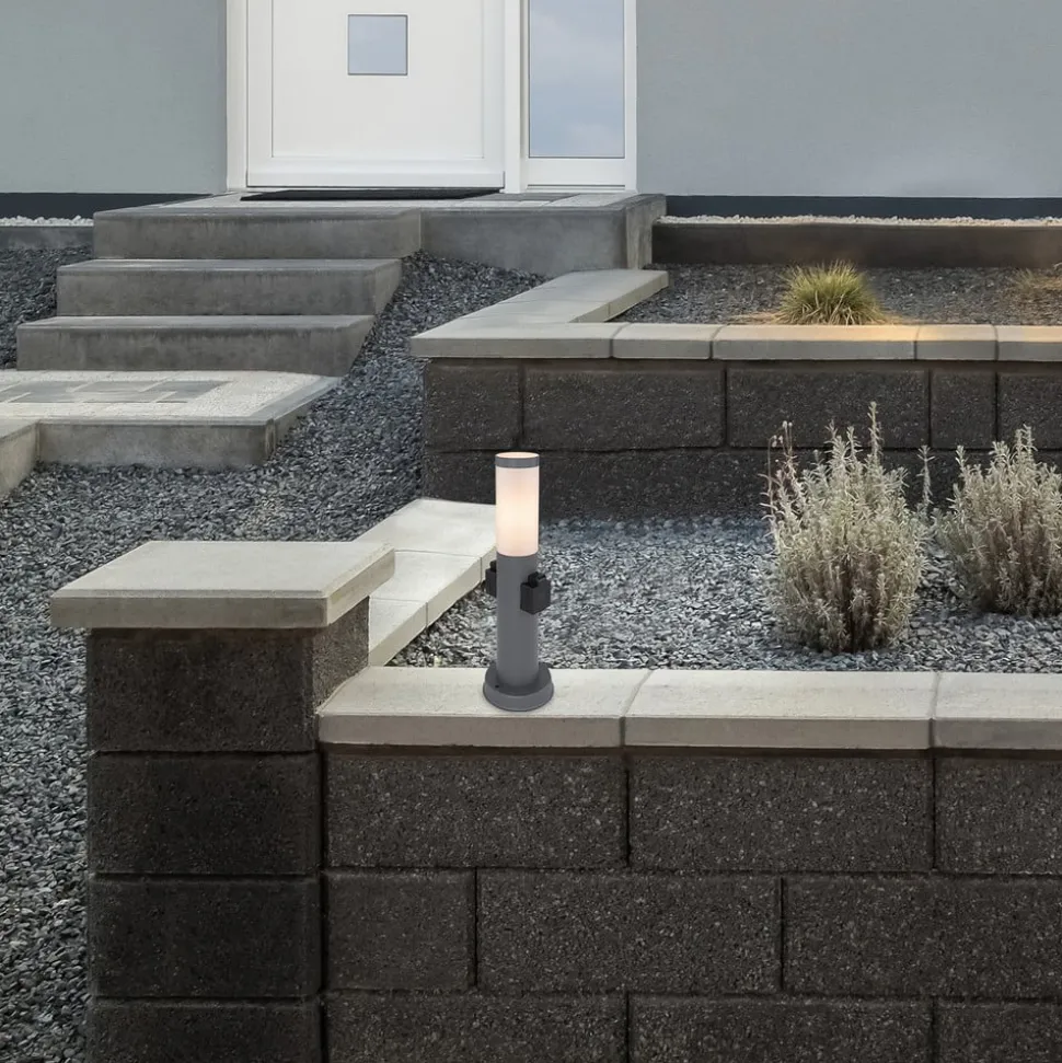 Modieuze sokkellamp Boston in een slank design met SOCKEL Die sokkellamp Boston biedt niet alleen stijlvolle verlichting, maar heeft ook twee stopcontacten op de sokkel. De armatuur is gemaakt van roestvrij staal en heeft daardoor een robuust en duurzaam karakter. De te gebruiken lamp zit achter een compact Element van kunststof en genereert niet-verblindende verlichting. Met zijn discrete design past de sokkellamp Boston goed in de sfeer van de buitenruimte en kan hij het huis of de tuin zelfs ’s nachts perfect verlichten en biedt hij ook een extra stroomaansluiting.