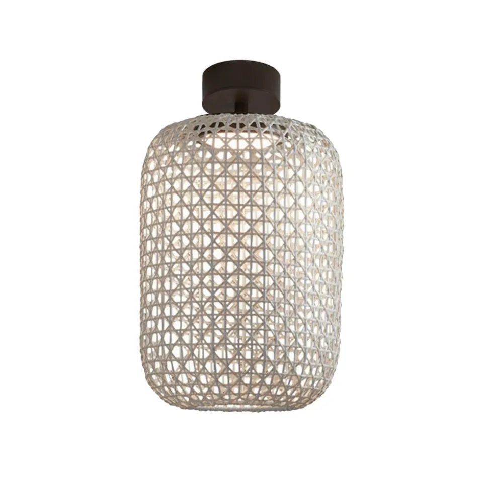 LED plafondlamp Nans voor buitenDe armaturen van de serie Nans zijn ontworpen door Joana Bover, de oprichter van het gelijknamige bedrijf uit Barcelona. Met haar ontwerpen wil de ontwerpster de lichtheid van de mediterrane levensstijl overbrengen. De plafondlamp Nans heeft een kap die gemaakt is van een rieten stof, die bestaat uit synthetische vezels. De beschermingsklasse IP54 beschermt de lamp tegen vocht en stof, zodat deze zonder problemen buiten gebruikt kan worden, bijvoorbeeld in paviljoens, op het terras of het balkon.
