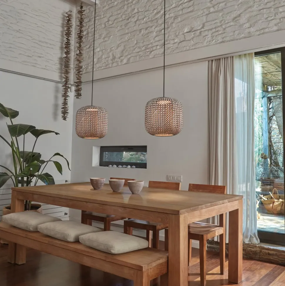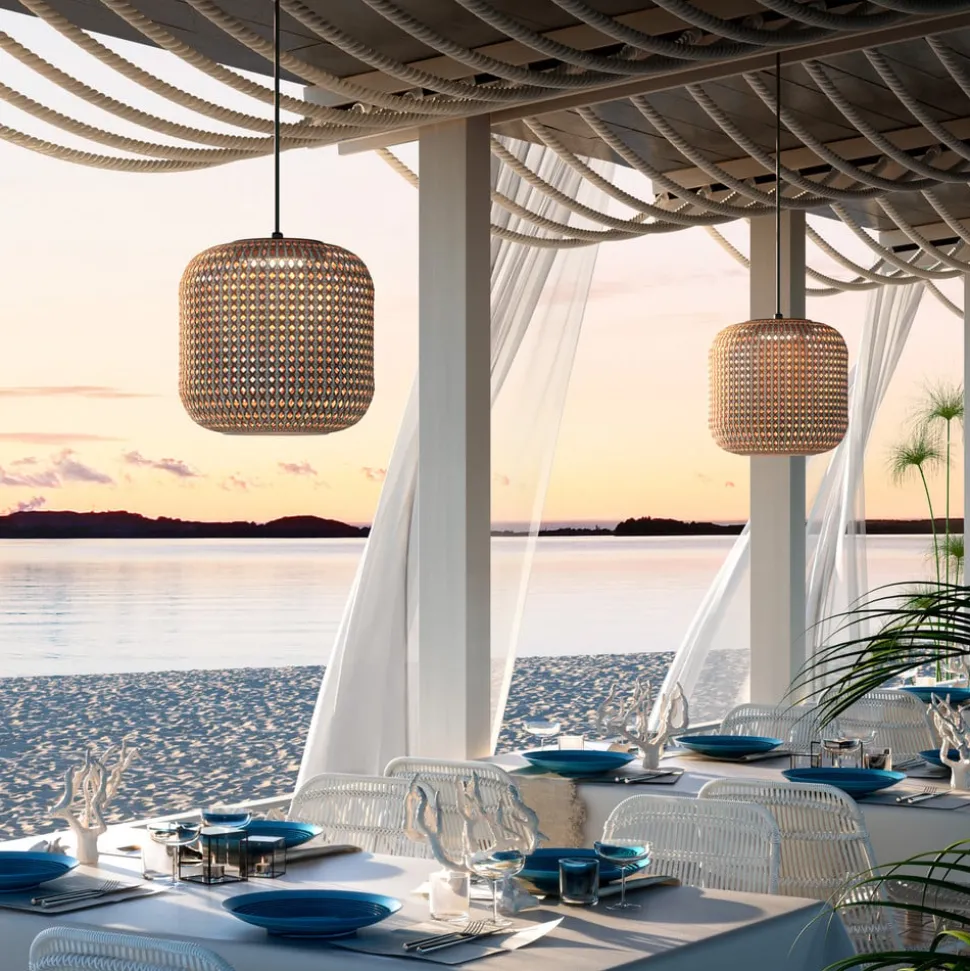 Designer buiten hanglamp Nans A met geweven kapHet designbedrijf Bover, gevestigd in Barcelona, belichaamt de mediterrane levensstijl met zijn Made in Spain producten. De hanglamp Nans is ontworpen voor buitengebruik, maar kan ook binnenshuis worden gebruikt. De cilindervormige kap is geweven van een synthetische vezel, waarbij verschillende gekleurde draden met elkaar verweven zijn. De hanglamp is triac dimbaar, de dimmer is niet inbegrepen.