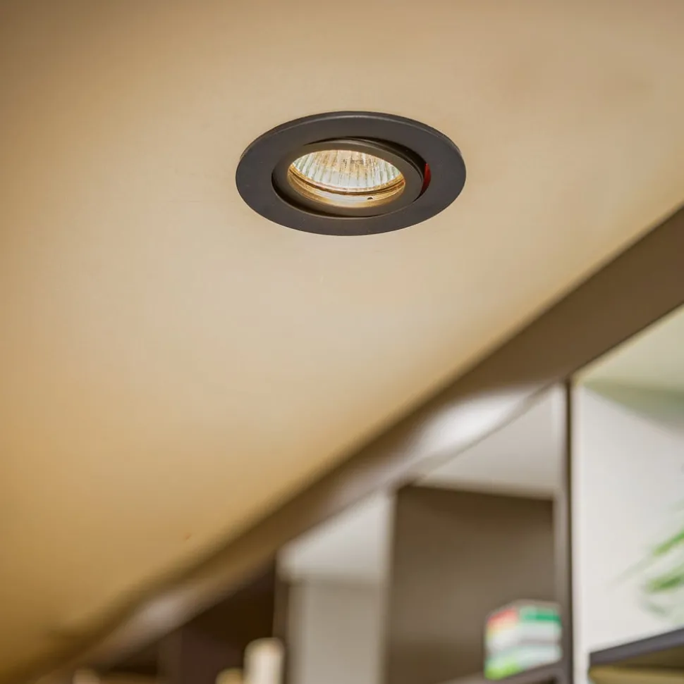 Ronde plafondinbouwspot Tirrel-R met draaibare kop De ronde aluminium inbouwspot 0063 is een veelzijdige downlight voor droge binnenruimtes – van gangen en keukens in privéwoningen tot gangen, vergaderzalen en eetzalen in hotels. Dankzij de draaibare, ronde kop kan de lichtuitstraling naar het gewenste gebied worden gericht. 0063 wordt met behulp van twee montagebeugels in de plafondopening gestoken – externe 230 V tot 12 V AC voorschakelapparatuur vereist (zie accessoires) – zwenkbereik: 25° rondom – plafonddikte: MAX. 1,5 cm