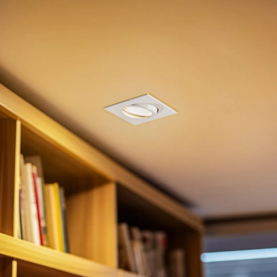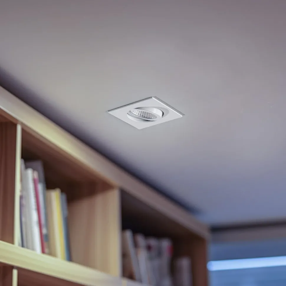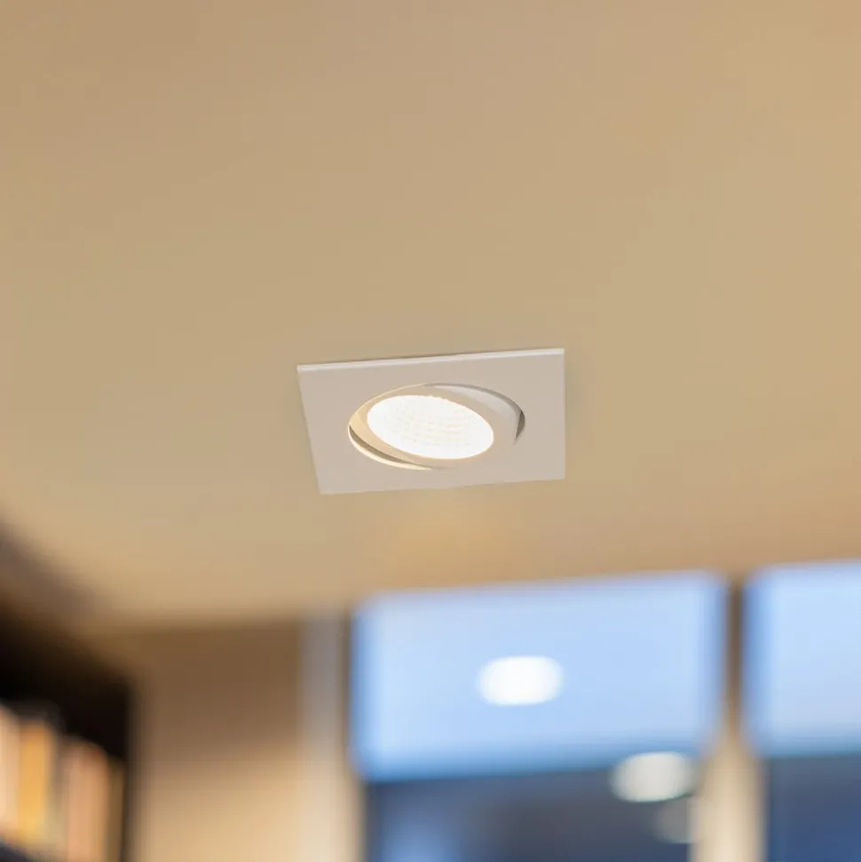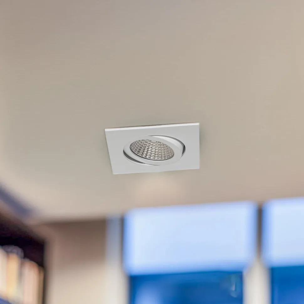 Zwenkbare LED inbouwdownlight BB05 van aluminium De BB05 inbouwarmatuur is eenvoudig en modern. Het vierkante frame omsluit een ronde armatuurkop die in de gewenste richting kan worden gericht. BB05 biedt directe verlichting voor privé- en openbare ruimten in droge binnenruimten zoals een gang, lobby of eetkamer. Twee bevestigingsveren voor montage zonder gereedschap inbegrepen – Niet-dimbare LED-converter inbegrepen – Stralingshoek: 38° – Zwenkbereik: 30° rondom – Plafonddikte: max. 1,3 cm – Geen afdekking met thermisch isolatiemateriaal