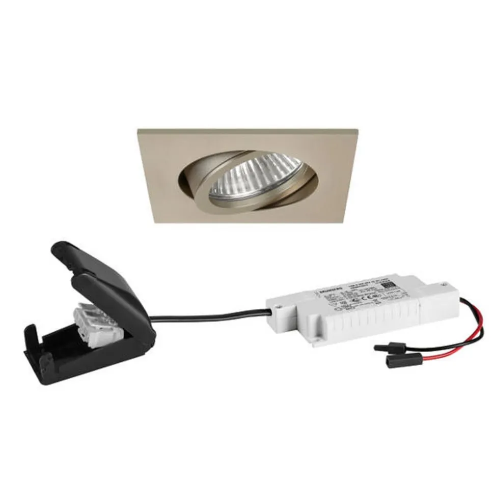 BB19 LED inbouwarmatuur met fase-afsnijdbare (RC) dimmer en aansluitdoos De BB19 inbouwspot met vierkant frame wordt aansluitklaar geleverd, inclusief LED driver dimbaar via externe fase-afsnijdbare (RC) dimmer en aansluitdoos. Een speciaal kenmerk van deze spot is de dim-2-warm functie, die ervoor zorgt dat de lichtkleur verandert tijdens het dimmen. Bij volle lichtsterkte is de lichtkleur 3.000 K; bij dimmen neemt de lichtkleur af tot 1.800 K. – dimbaar met externe fase-afsnijdingsdimmer – dim-2-warm-functie (3.000 K – 1.800 K) – zilverkleurige reflector met rotatiesymmetrische diepe lichtverdeling – afdekking van transparant glas – toelaatbare omgevingstemperatuur -20 tot 25 °C – met elektronisch voorschakelapparaat, fase-afsnijdingsdimbaar – geen afdekking met isolatiemateriaal – incl. aansluitdoos 3-polig voor doorvoerbedrading