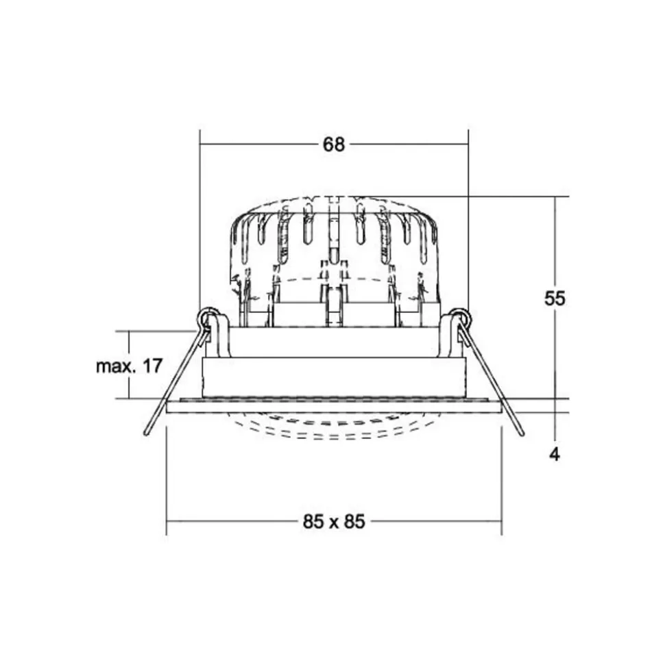 BB25 inbouw LED downlight met dimbare LED driver en aansluitdoos Deze vierkante LED inbouwspot bestaat uit een ronde, draaibare spot in een vierkante behuizing, een LED driver (RC) die gedimd kan worden met een fase afsnijdimmer en een aansluitdoos. De 15° draaibare downlight met hoge beschermingsgraad IP5 kan worden gebruikt om vochtige ruimtes zoals badkamers, wellnessruimtes, sauna’s enz. te verlichten. De spot is uitgerust met een warmwitte LED in een zilverkleurige reflectorlamp met rotatiesymmetrische diepliggende lichtverdeling achter een transparante kunststof afdekking en spot licht met een stralingshoek van 36°. Voorzien van bevestigingsveren voor montage zonder gereedschap – maximale plafonddikte 1,7 cm – inclusief elektronisch voorschakelapparaat, dimbaar (RC) – met aansluitdoos, 3-polig voor doorvoerbedrading – toelaatbare omgevingstemperatuur – 20 tot 25 °C – mag niet worden afgedekt met isolatiemateriaal – hoge beschermingsgraad IP65 – 15° zwenkbaar