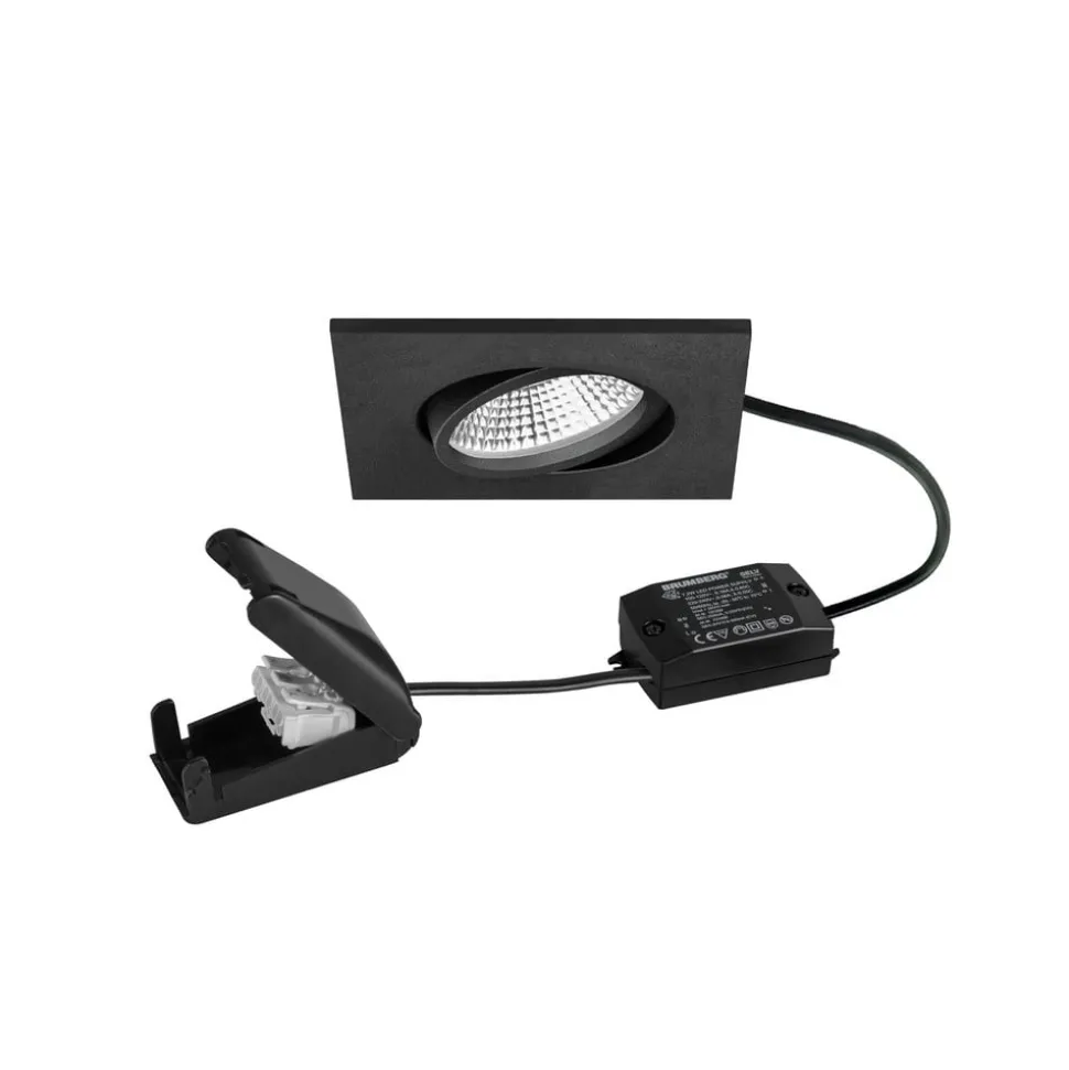 Inbouwspot LED BB25 IP65 met schakelbare LED driver en aansluitdoos De hoekige inbouwspot LED BB25 met 15° zwenkbare spot kan dankzij beschermingsgraad IP65 in badkamers, wellnessruimtes enz. geïnstalleerd worden. De spot kan zonder gereedschap in plafonds tot een maximale dikte van 1,7 cm geïnstalleerd worden met behulp van montageveren. Hij wordt aansluitklaar geleverd met aansluitdoos en schakelbare LED driver en is niet dimbaar. Het warmwit licht wordt onder een hoek van 36° uitgestraald door de zilverkleurige reflectorlamp met rotatiesymmetrische diepliggende lichtbundel en optimaal verdeeld door de transparante kunststof afdekking.