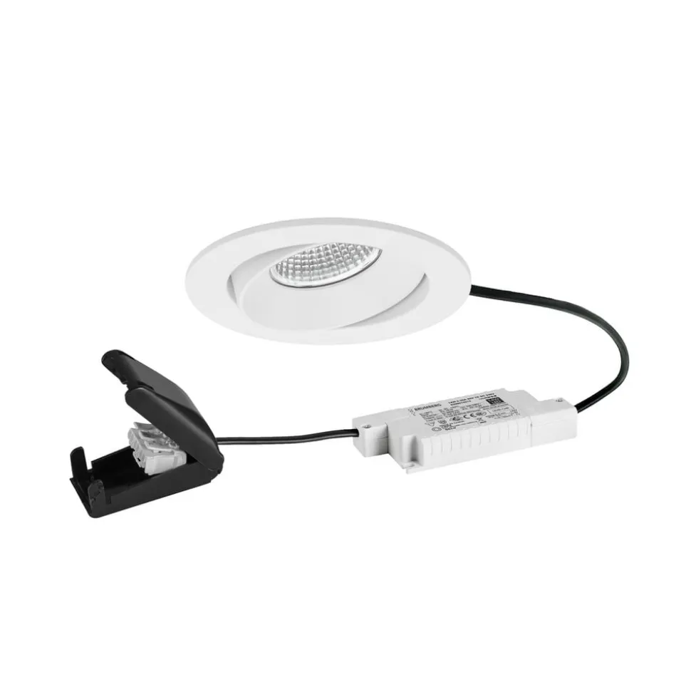 Inbouwspot LED BB35 met dimbare LED driver en aansluitbox BB35 is een draaibare LED inbouwspot voor gereedschapsloze plafondmontage met montageveren, die aansluitklaar op 230 V wordt geleverd met een LED driver die kan worden gedimd met een fase afsnijdimmer (RC) en een aansluitbox. De spot is uitgerust met een zilverkleurige reflectorlamp met rotatiesymmetrische, smal stralende lichtverdeling, zodat het licht krachtig en optimaal door de transparante polycarbonaatafdekking wordt verspreid – incl. elektronisch voorschakelapparaat, fase-afsnijdbaar dimbaar – incl. aansluitdoos, 3-polig voor doorvoerbedrading – toelaatbare omgevingstemperatuur (ta): -20 °C – +25 °C – spot 20° rondom zwenkbaar – maximale plafonddikte 1,5 cm