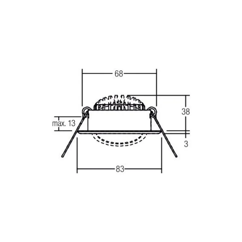 Inbouwspot LED BB09 met dimbare driver (RC) De ronde LED inbouwspot BB09 is perfect voor commerciële en openbare interieurs, zoals gangen of evenementenruimtes. Hij is uitgerust met warmwitte LED’s die in een kop zitten met een zilveren reflectorlamp met een rotatiesymmetrische, brede lichtbundel. De spot kan 25° rondom worden gedraaid zodat de lichtstraal op het gewenste gebied kan worden gericht. De BB09 inbouwspot wordt aansluitklaar geleverd met LED driver dimbaar via fase afsnijdimmer en montageveren voor montage zonder gereedschap aan het plafond – Inclusief LED converter; extern dimbaar via fase afsnijdimmer (RC) – Stralingshoek: 38° – Zwenkbereik: 25° rondom – Plafonddikte: max. 1,3 cm – Mag niet worden afgedekt met thermisch isolatiemateriaal