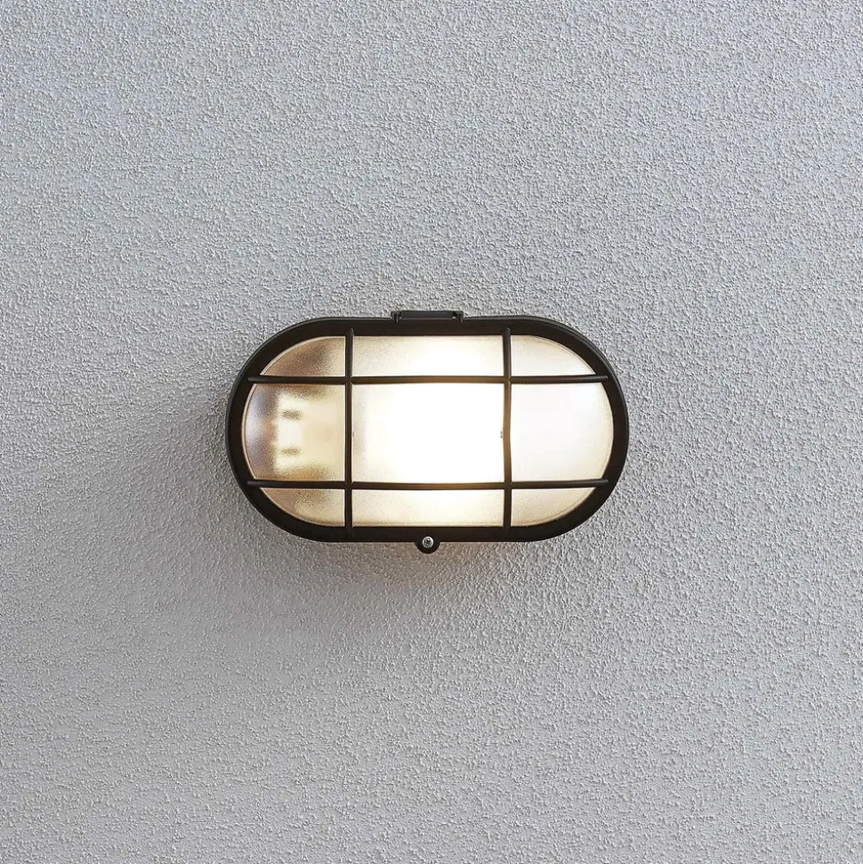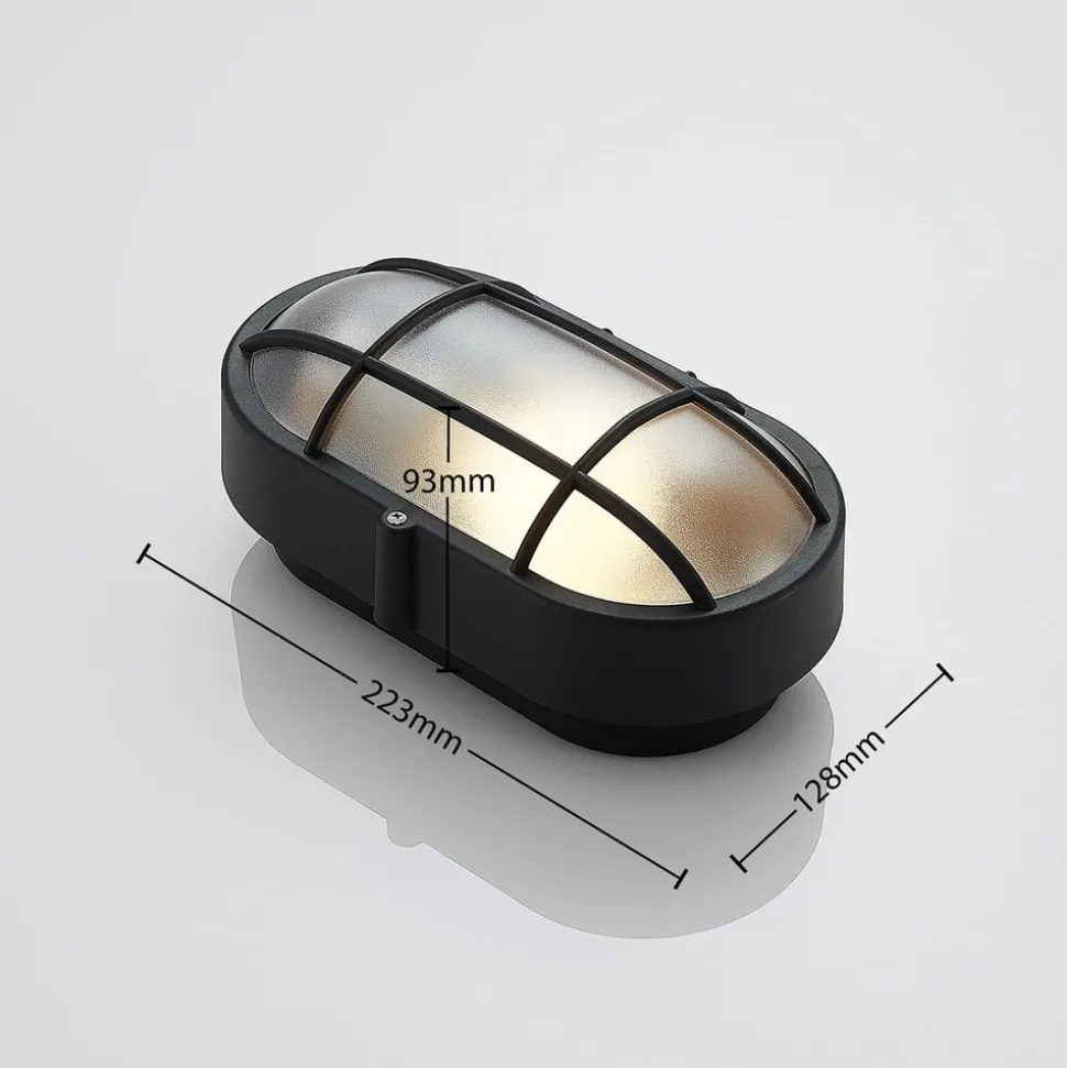 Elliptisch gevormde buitenwandlamp Alisha met zwarte afwerking en grillafdekking, zeewaterbestendig