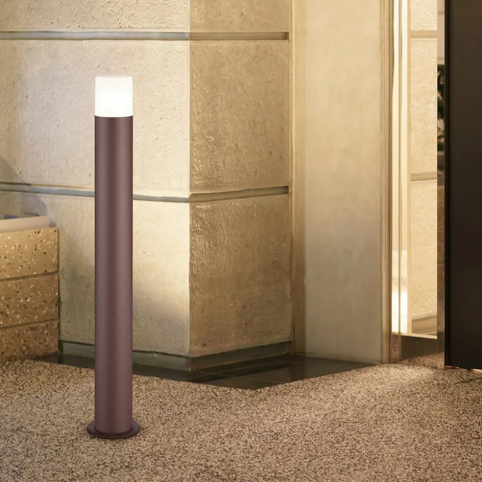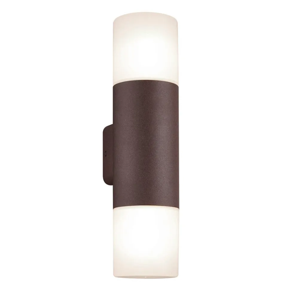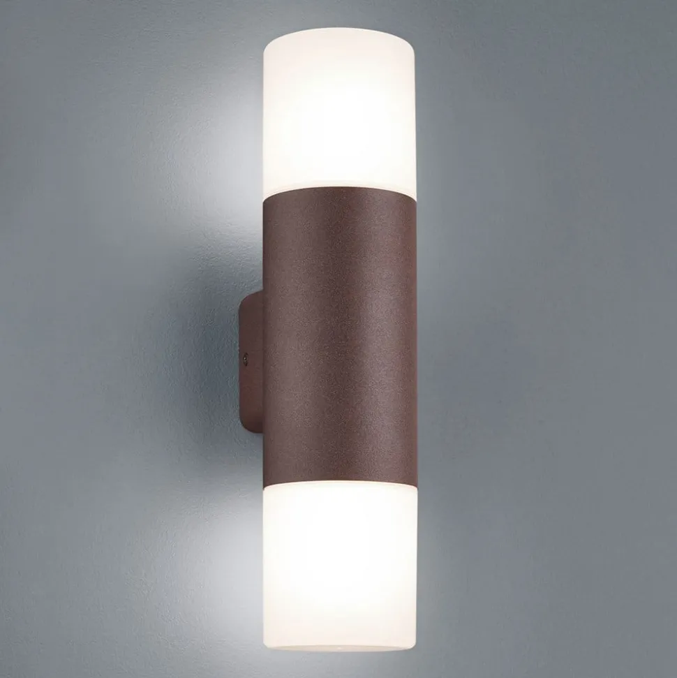 Met haar dubbele lichtstraling door de twee boven en onder in het roestbruine metalen frame geplaatste diffusors van witte kunststof, creëert de buitenwandlamp Hoosic een mooi effect op de gevel en zorgt voor de verlichting van een groot oppervlak. Dankzij de moderne cilindervorm en de roestbruine verf kan het op vrijwel elke gevel worden aangebracht. Het is zeer effectief om twee armaturen naast een venster of naast de ingangs- of terrasdeur te installeren.