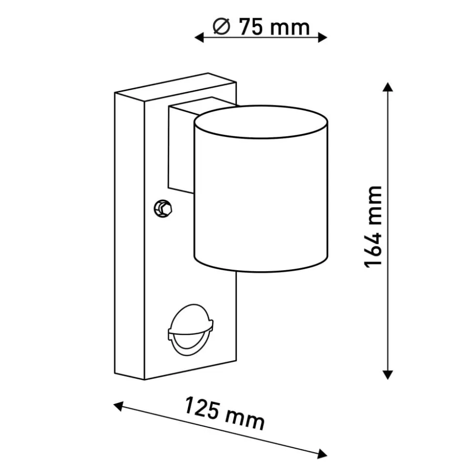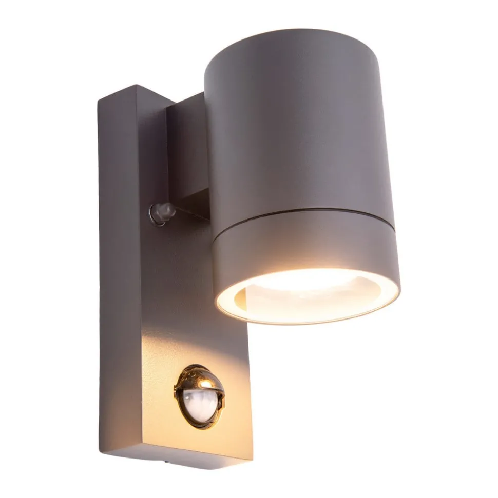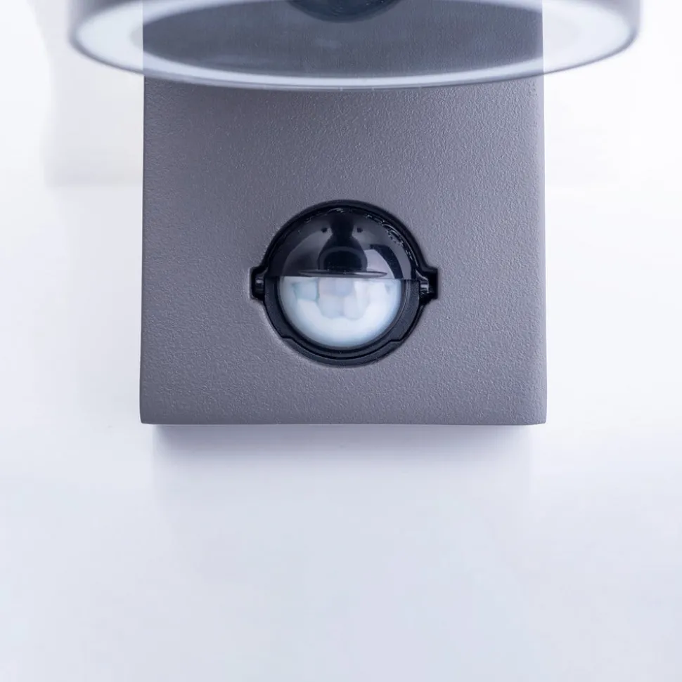 Rombe buitenwandlamp met sensor, neerwaartse lichtbundelDe Rombe buitenwandlamp van antracietkleurig gepoedercoat aluminium straalt zijn licht naar beneden en is voorzien van een sensor op de wandhouder. De sensor detecteert beweging in een hoek van 120° en op een afstand van 8-10 meter en schakelt vervolgens het licht automatisch in. – Lichtduur instelbaar van 10 seconden tot 5 minuten