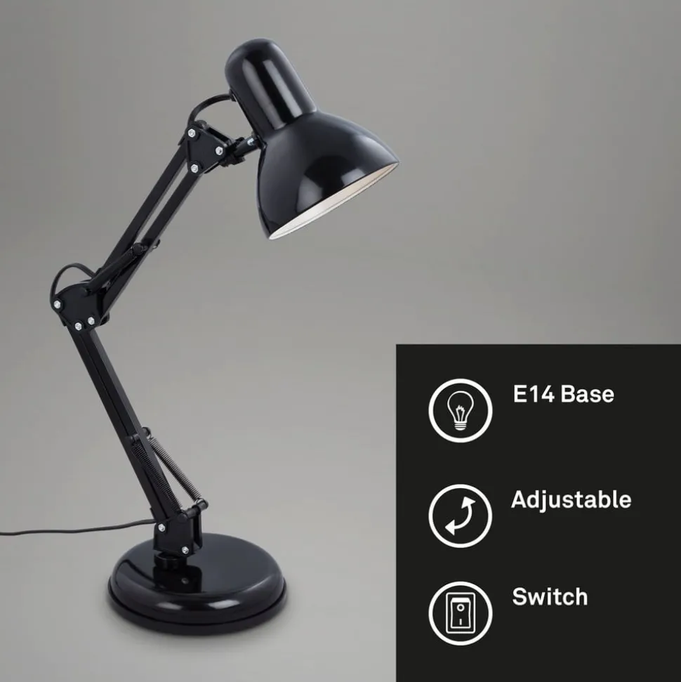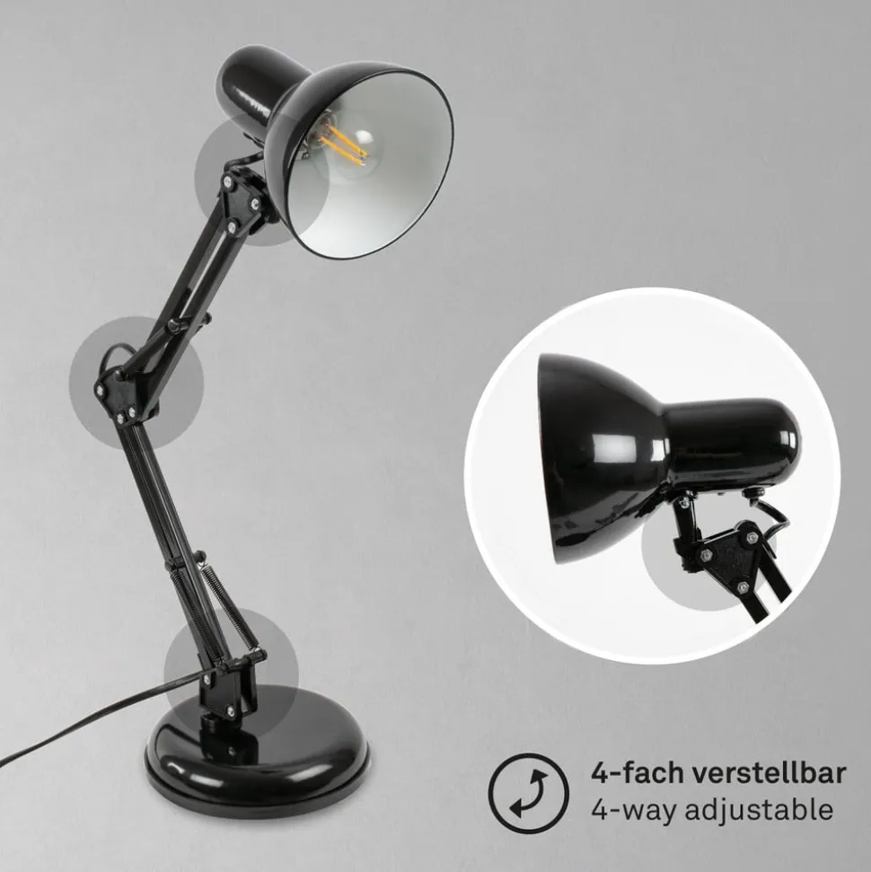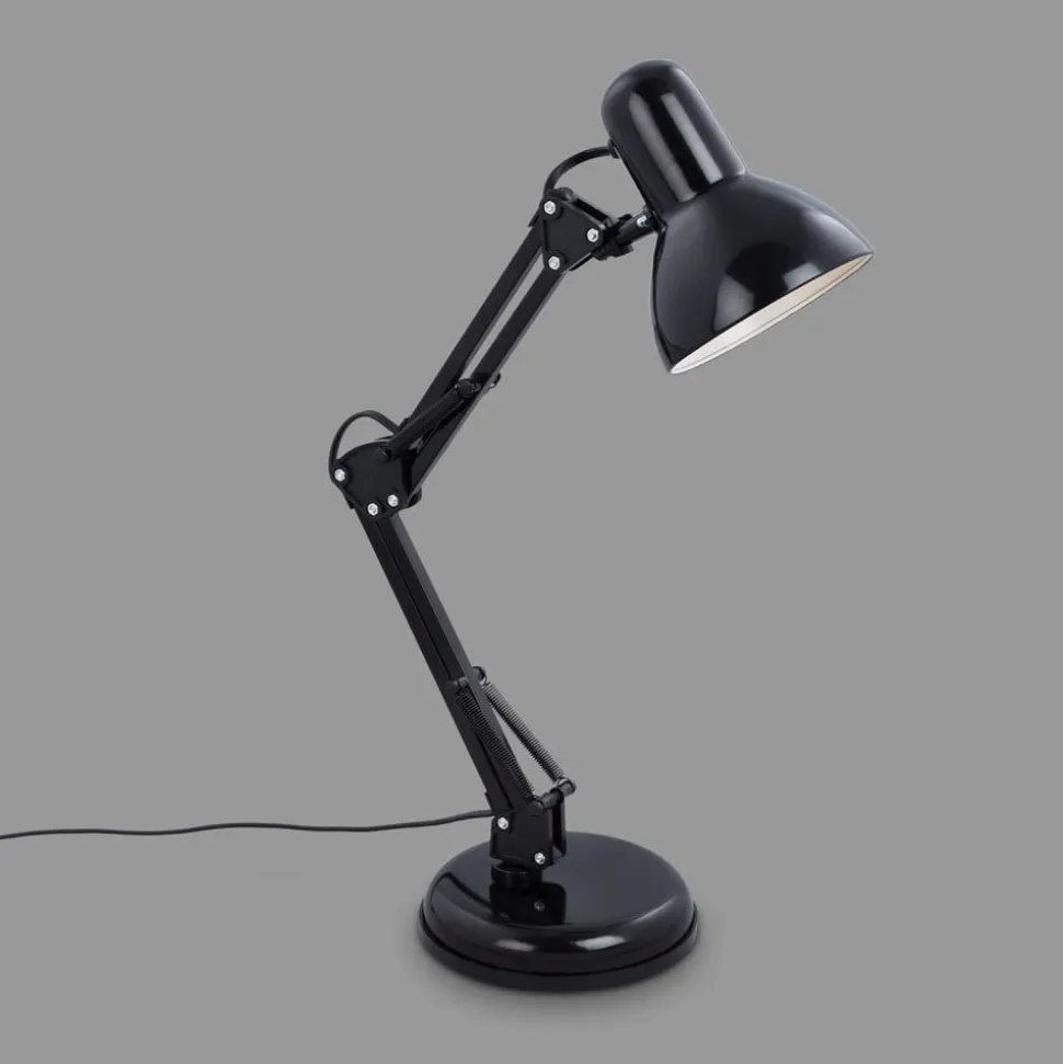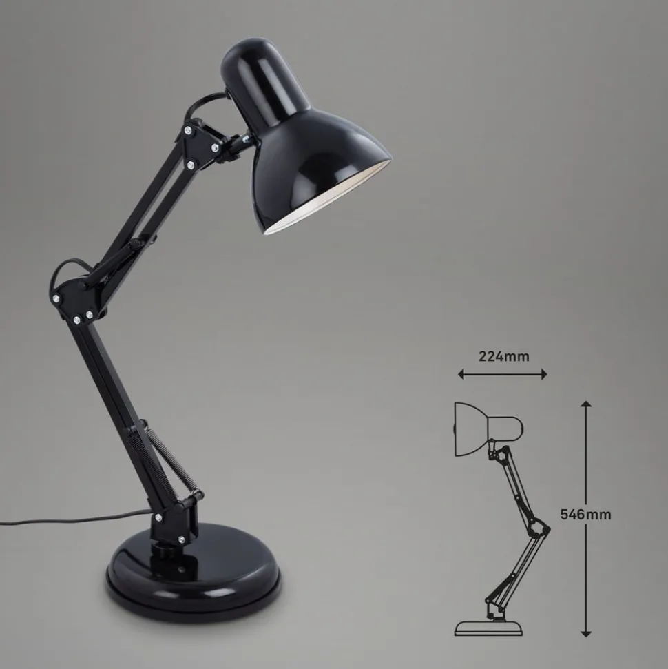 Verstelbare bureaulamp Pixa in zwart retro designDe Pixa tafellamp is gemodelleerd naar het originele ontwerp van de bureaulamp. De twee delen van het frame en de kap zijn verstelbaar, er worden open scharnieren en veermechanismen gebruikt voor het verstellen en dit kenmerkt het uiterlijk van Pixa. Bij de zwarte tafellamp is alleen de binnenkant van de kap wit, wat lichtuitstraling met een laag verlies bevordert. Uitgerust met een schakelaar op de plug-in kabel.