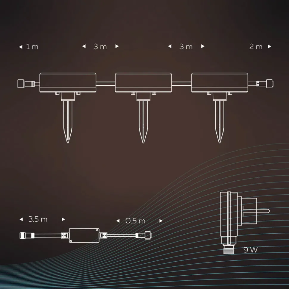 - Totale kabellengte 13 m; afstand tussen armaturen 3 m