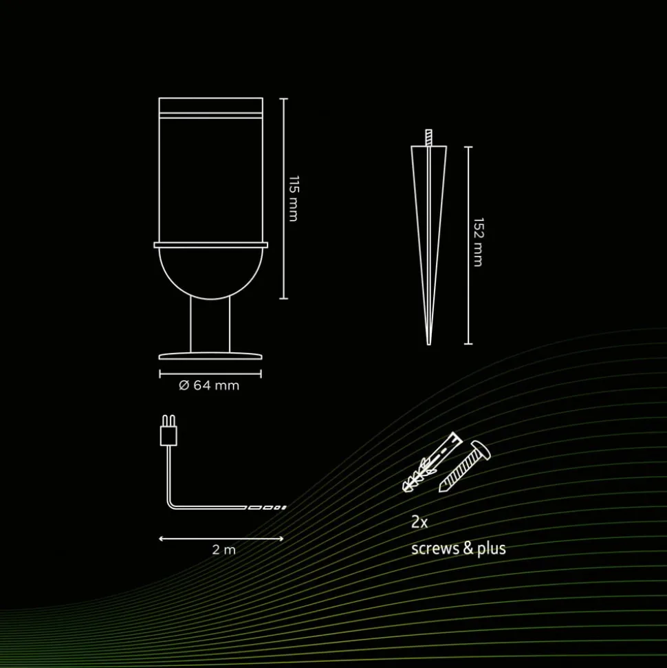 Lengte spot 11,5 cm; hoogte grondspies 15,2 cm; kabellengte 200 cm