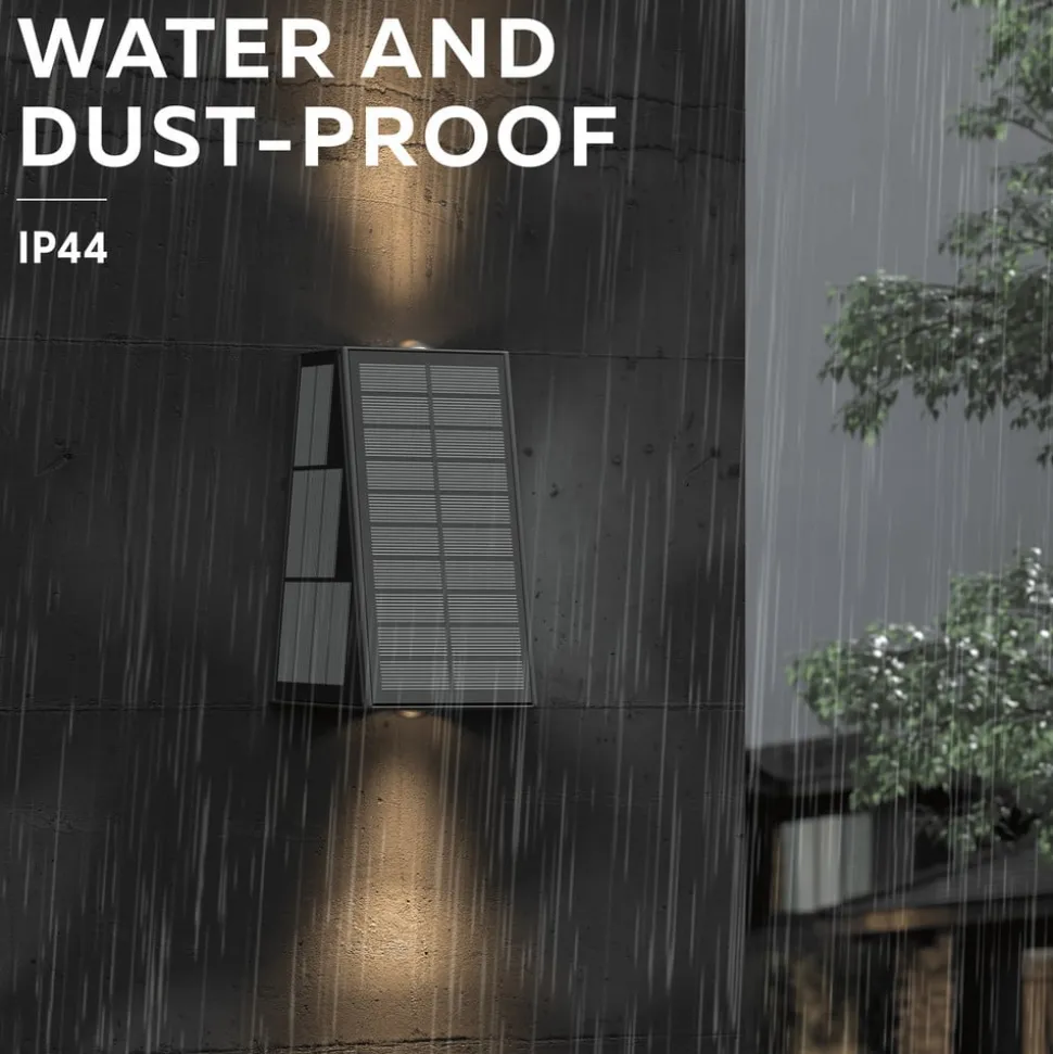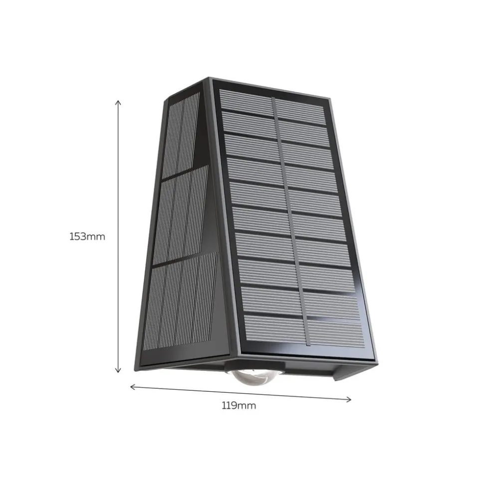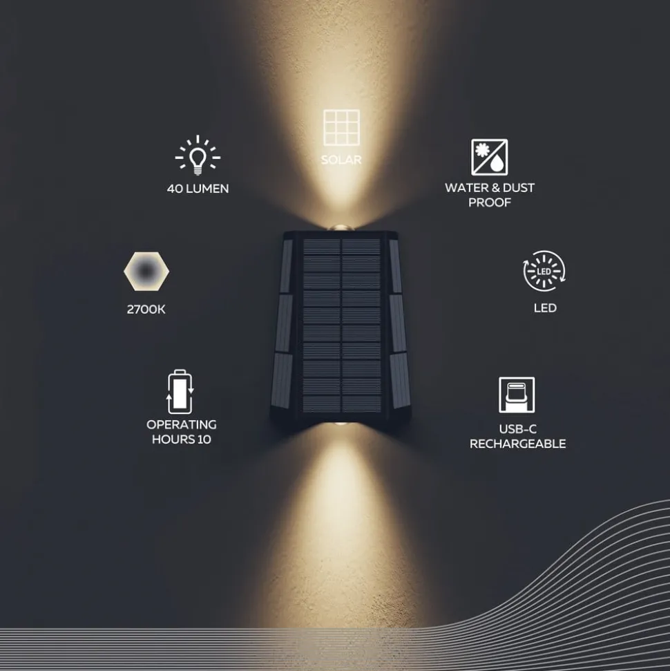 De LED buiten wandlamp Matera werkt volledig op zonne-energie en laadt overdag automatisch op – ideaal voor gevels, hekken en tuinmuren. Op dagen met weinig zonlicht kan de lamp eenvoudig worden opgeladen via de meegeleverde USB-C-kabel. De Matera wandlamp straalt warmwit licht zowel naar boven als naar beneden. Met de IP44-certificering is de lamp beschermd tegen regen en vocht – perfect voor permanent gebruik buitenshuis. De robuuste behuizing garandeert een lange levensduur en betrouwbaarheid onder alle weersomstandigheden. De lamp wordt geleverd met montageaccessoires en kan eenvoudig aan elke buitenmuur worden bevestigd. De geïntegreerde 2x 1200mAh accu biedt tot 10 uur licht na 4-6 uur opladen.