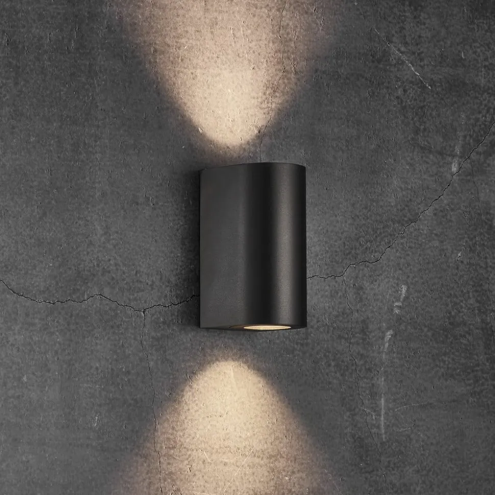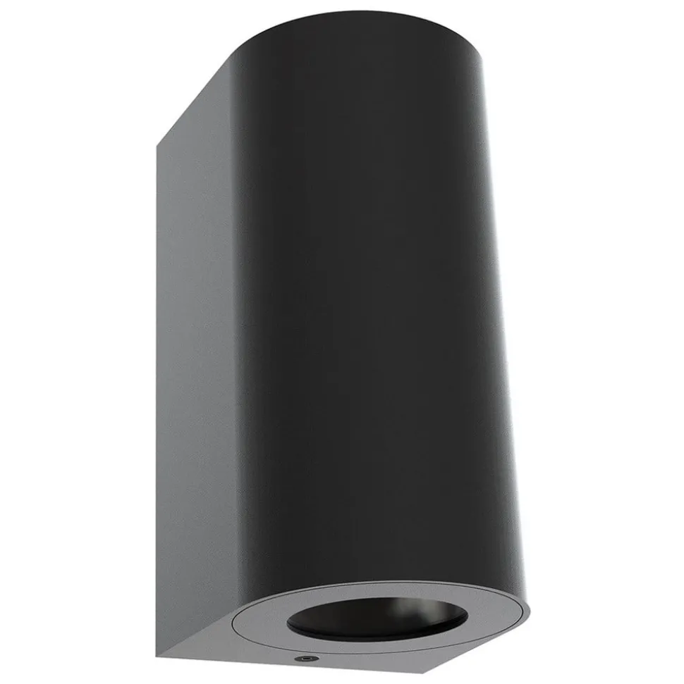 Halfronde buitenwandlamp Canto Maxi 2 Seaside in duurzaam zwart De Canto Maxi 2 Seaside buitenwandlamp heeft aan de voorkant de vorm van een cilinder, terwijl de achterkant rechthoekig is. De aluminium behuizing bevat lichtuitgangen aan de boven- en onderkant, die zijn voorzien van heldere glazen afdekplaten. In totaal zijn er twee GU10 fittingen naar boven en naar beneden gericht, waardoor een aantrekkelijke accentverlichting en nuttige oriëntatieverlichting langs de gevel of bij de ingang ontstaat – Ontworpen door het Deense architectenbureau Bønnelycke MDD – Beschermingsgraad: IP44 – Corrosiebestendige, weerbestendige afwerking; geschikt voor gebruik dichtbij zee – Parallelle aansluiting met meerdere armaturen mogelijk