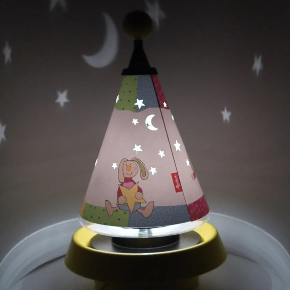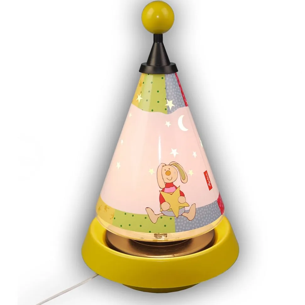 Kinderkamer tafellamp Carrousel Rainbow Rabbit De Carrousel Rainbow Rabbit tafellamp is een fascinerend nachtlampje dat de angst van kinderen voor het donker wegneemt. De kap van de lamp draait rond met behulp van een stille motor zodat het licht Innes de sterren en manen op de kap projecteert op de muren in de kamer. De lamp is uitgerust met een plug-in transformator en een snoerschakelaar voor gemakkelijke bediening. Het Rainbow Rabbit motief komt van de gelijknamige anti-pestcampagne, die kinderen wil leren over de gelijke behandeling van Allen.