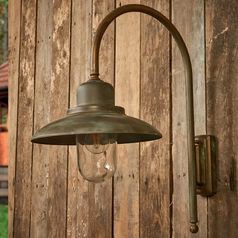 Casale – een antiek afgewerkte buitenwandlamp De Casale buitenwandlamp van antiek messing straalt mediterrane charme uit. De hoogwaardige lamp is zeewaterbestendig en kan dus ook in de buurt van de zee worden gebruikt. De expansieve wandlamp straalt helder licht uit door de heldere glazen kap, die elke buitenruimte verlicht.