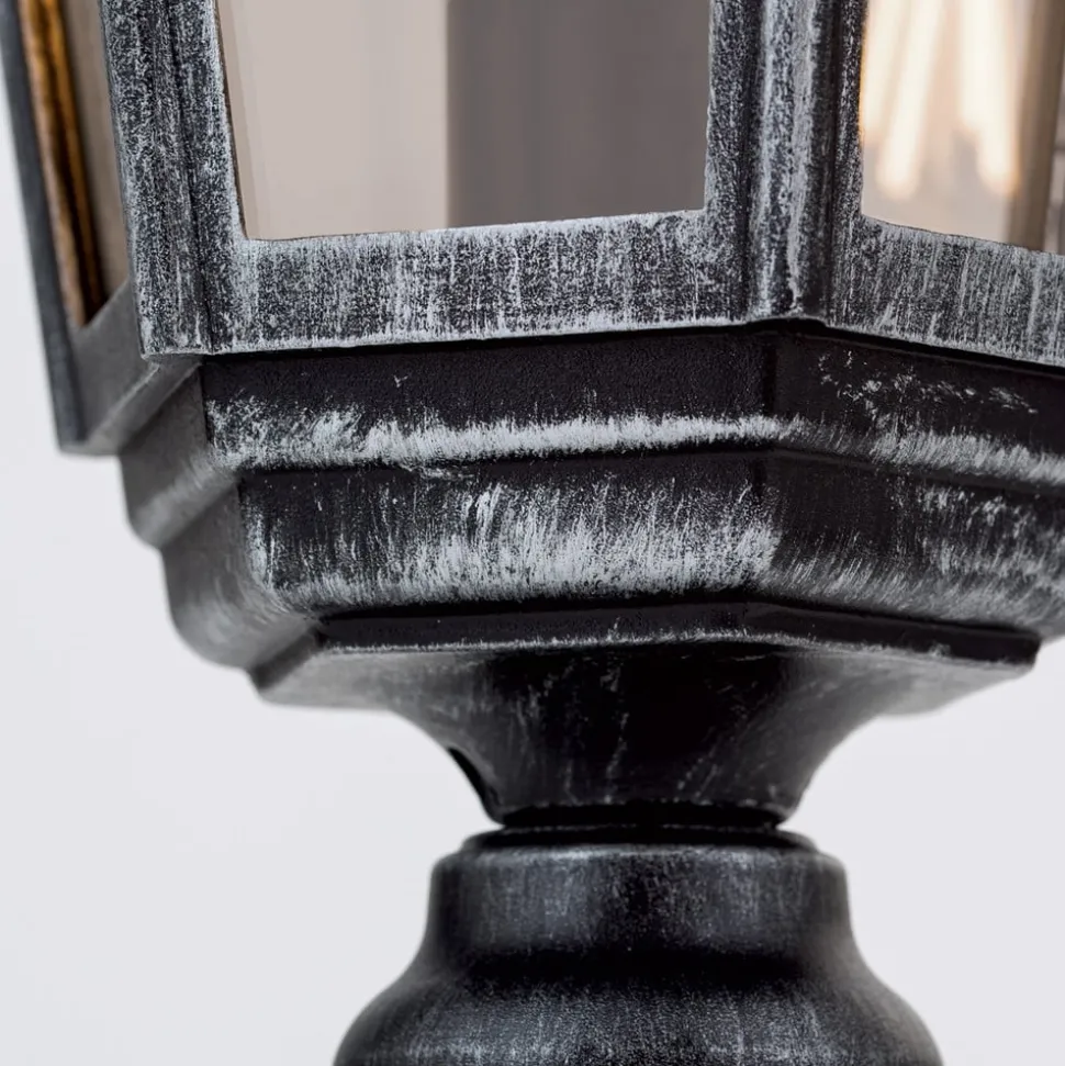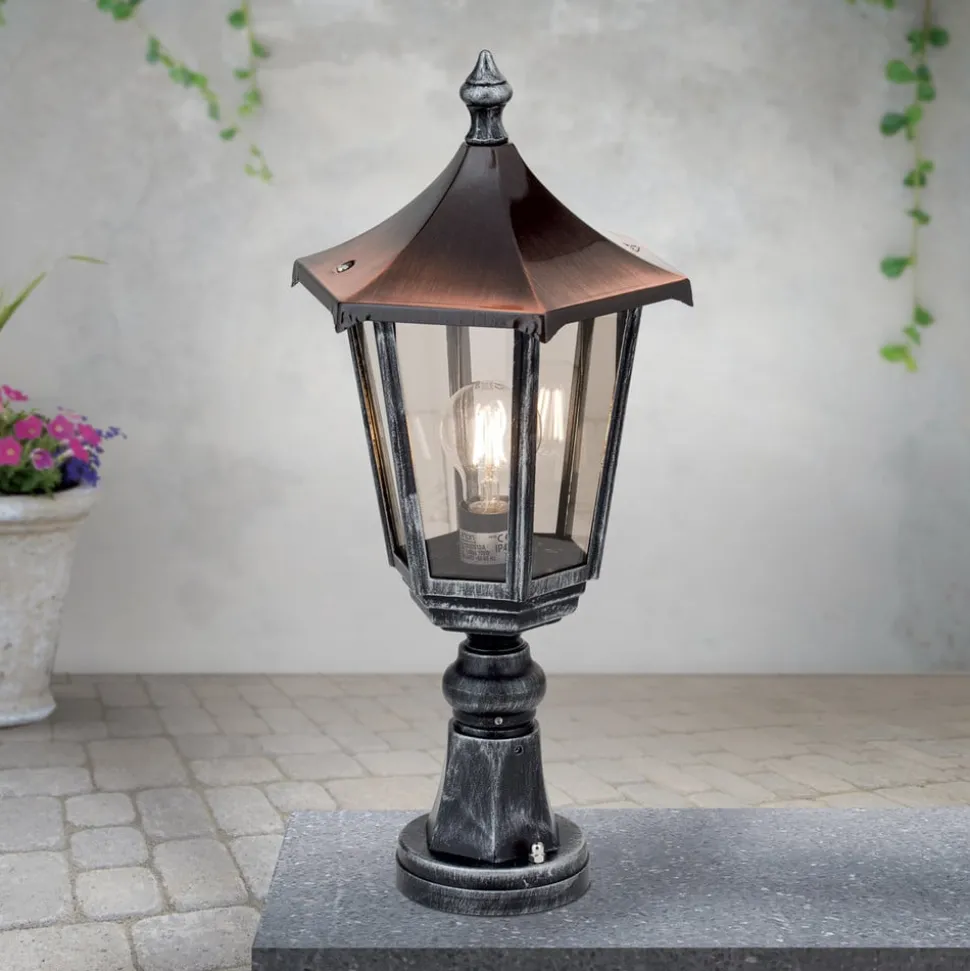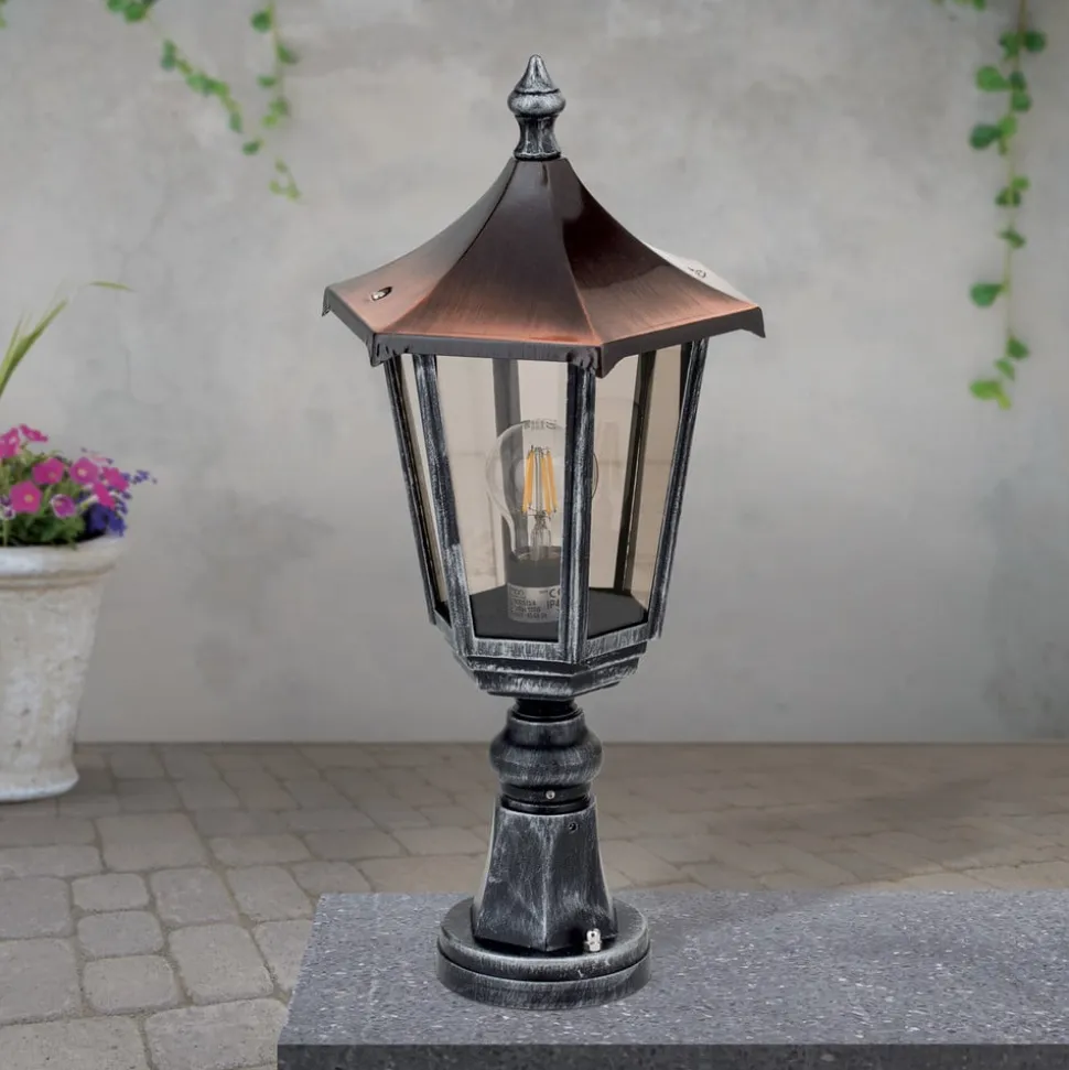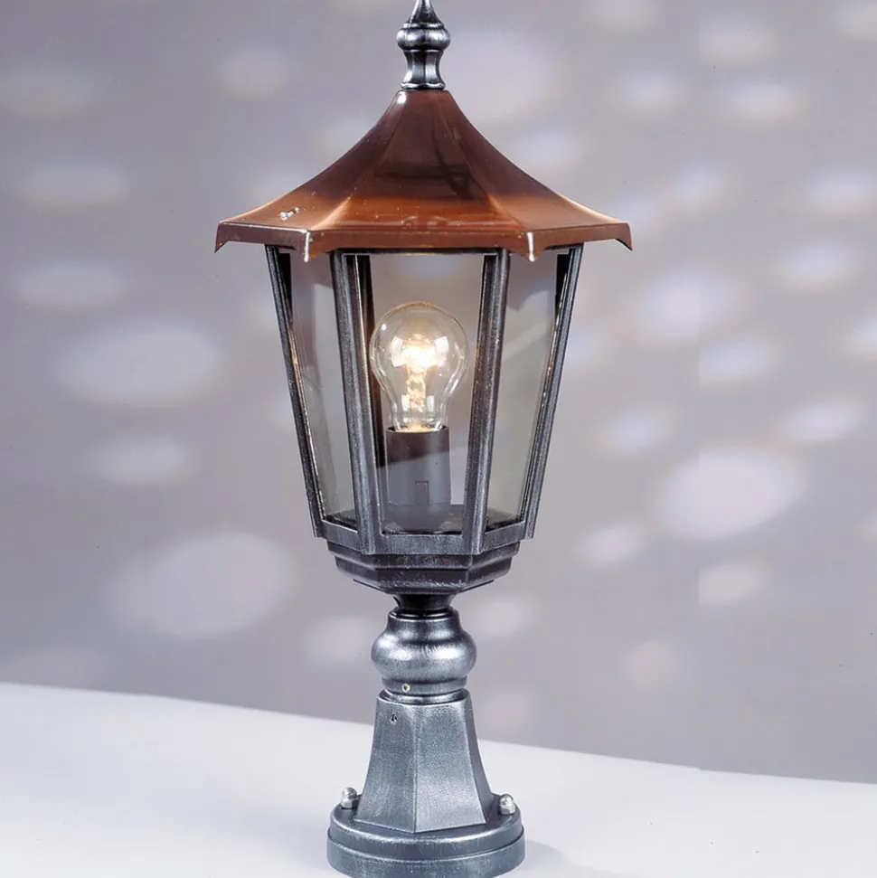 Door deze buitensokkel in te zetten, komt de charme van de afgelopen eeuwen in de buitenruimte van elk woonhuis weer tot leven. De gebruikte materiaalsoorten – zwart-grijs gelakt aluminium en roestbruine koperplaat – verspreiden een nostalgische charme, maar uiteindelijk is het ook de lantaarnvorm zelf die deze sokkellamp zijn specifiek antieke uitstraling geeft.