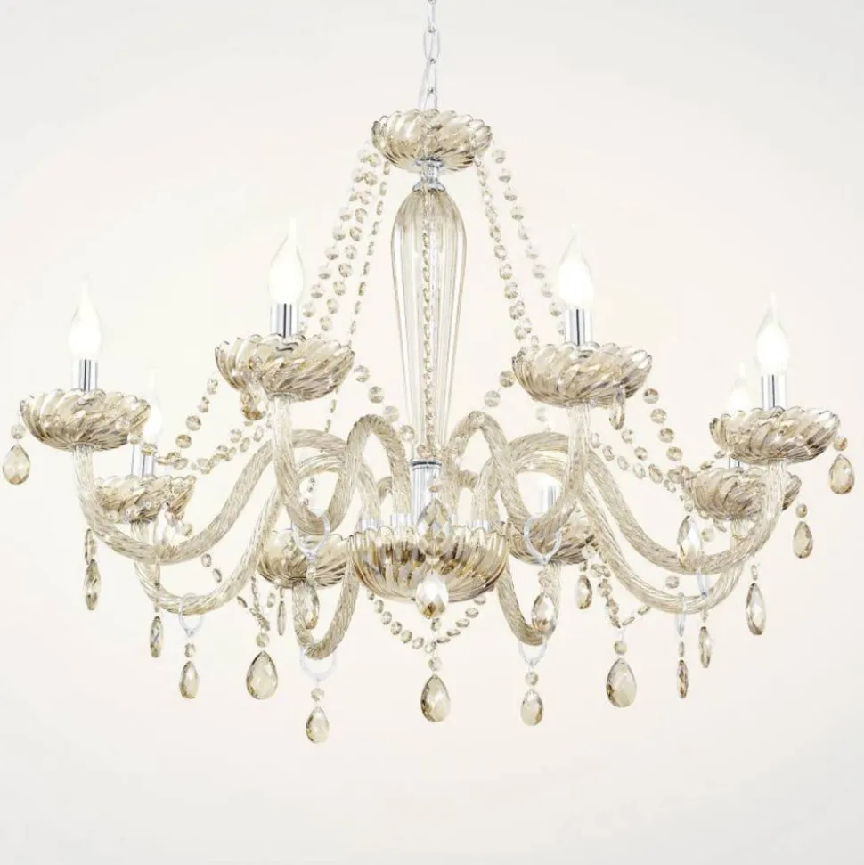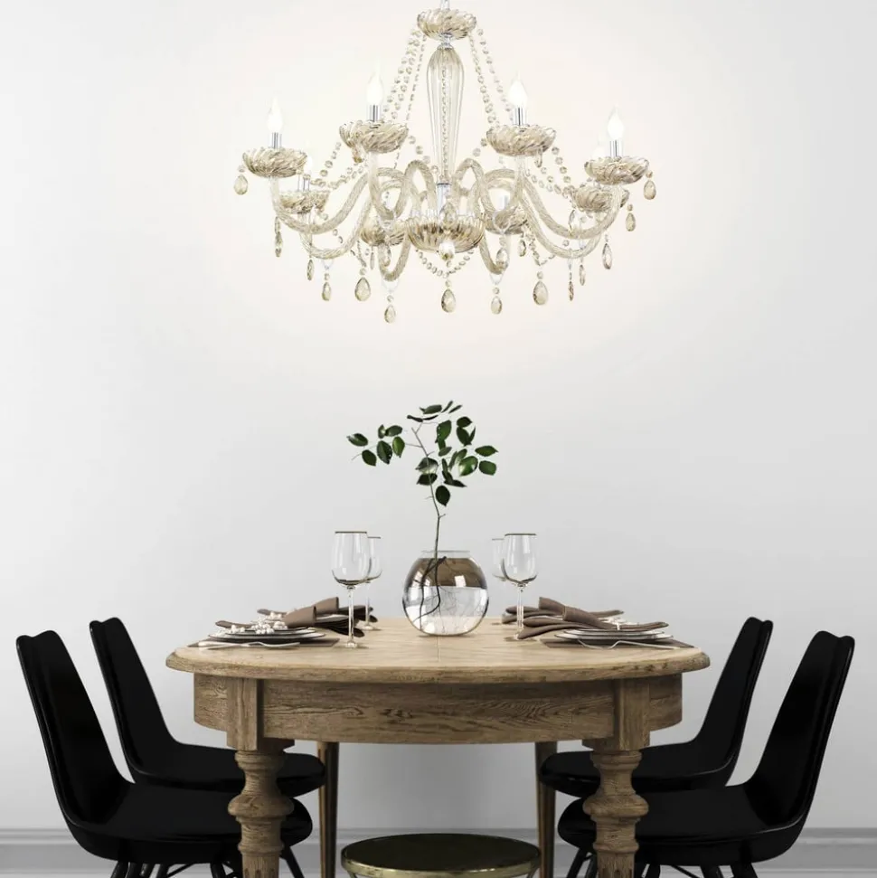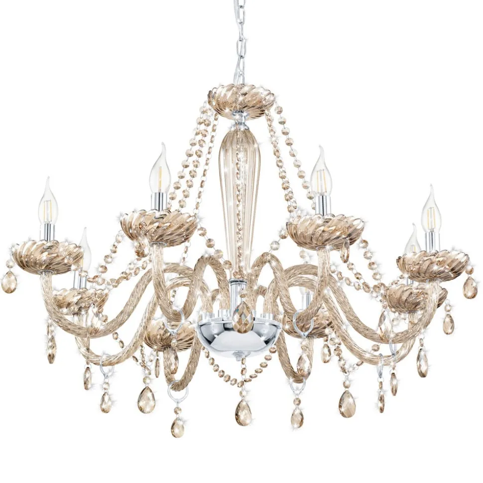 Kroonluchter Basilano maakt indruk met zijn elegante design, welke wordt benadrukt door zijn acht gebogen armen van cognackleurig glas. Daaraan bungelen fraai bewerkte glazen stenen, die het totaalplaatje een zeer sierlijk karakter geven. Met de chroom glanzende E14-fittingen en de chromen halfronde lichtkern, heeft het geheel een nog fraaiere uitstraling.