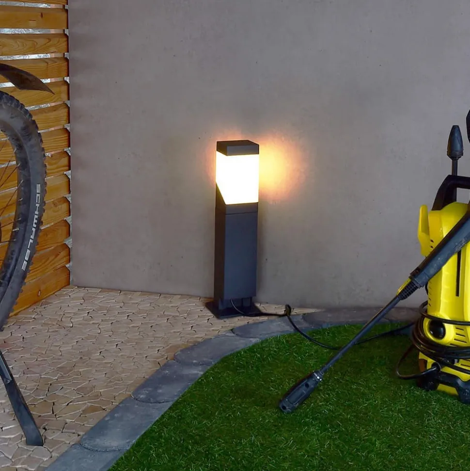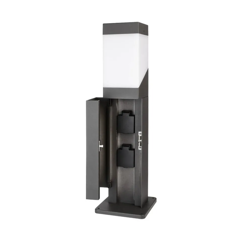 De rechthoekige Kukui Puka stopcontactzuil is gemaakt van een donkergrijs gegoten aluminium, wat de zuil tijdloos en stijlvol maakt. Kukui Puka is voorzien van twee stopcontacten en heeft een E27 fitting in het bovenste gedeelte achter opaal plastic. De beschermingsgraad IP54 garandeert een probleemloze stroomvoorziening buitenshuis voor bijvoorbeeld tuingereedschap. Het deksel kan volledig worden gesloten wanneer de haakse stekkers zijn geplaatst. De twee stopcontacten mogen met maximaal 3.650 W worden belast.