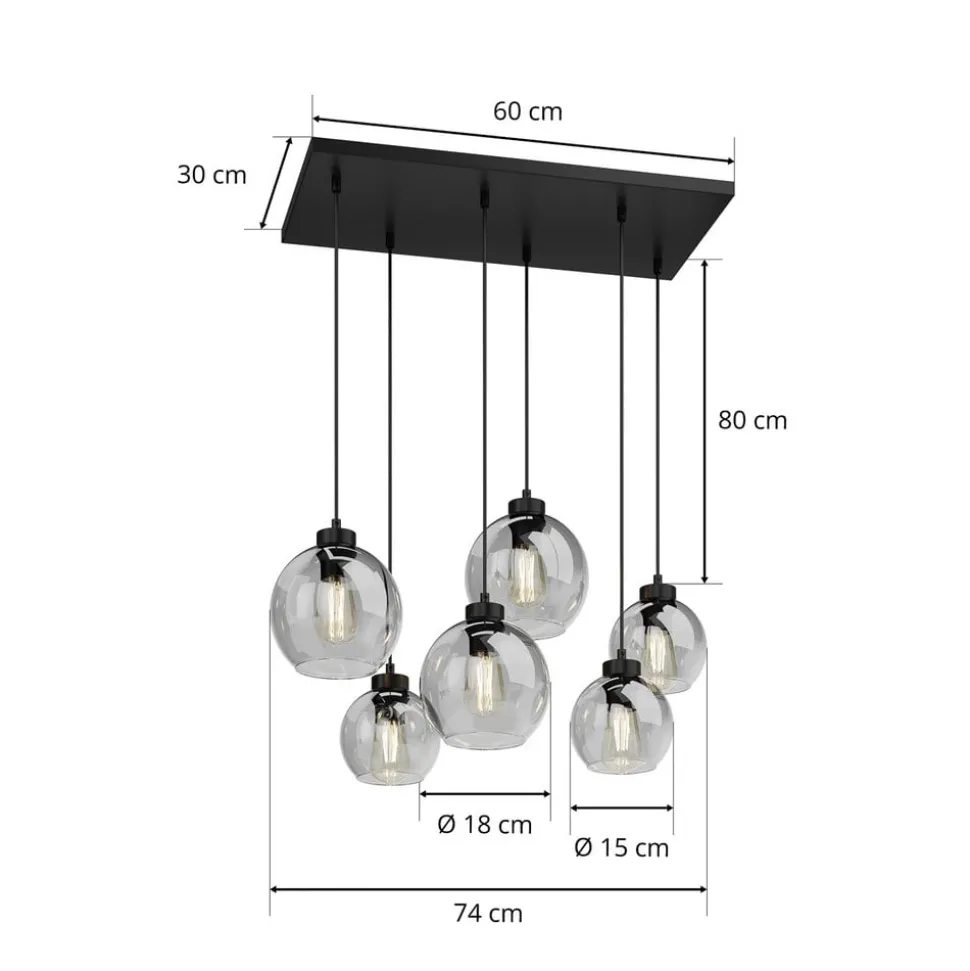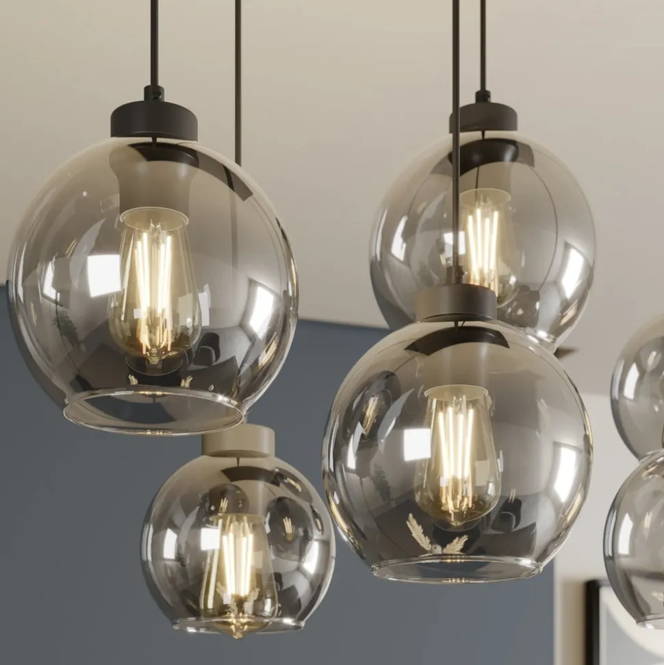 Cubus hanglamp: 6-lamps design in rookgrijs voor stijlvolle verlichting Ervaar hoe de Cubus hanglamp een speciaal tintje geeft aan elke kamer met zijn 6-lamps design en aantrekkelijke rookgrijze glazen kappen. De moderne stijl van deze lamp past naadloos in het interieurontwerp van de woonkamer, keuken of eetkamer en creëert een sfeer die uitnodigt tot zowel ontspanning als creativiteit. Hoewel een dimmer niet is inbegrepen, kan de intensiteit van het licht worden aangepast aan persoonlijke voorkeur door een externe dimmer te installeren om de gewenste sfeer te creëren. Met de Cubus hanglamp kun je een duidelijk designstatement maken en tegelijkertijd genieten van de flexibiliteit om de verlichting aan te passen aan je behoeften.