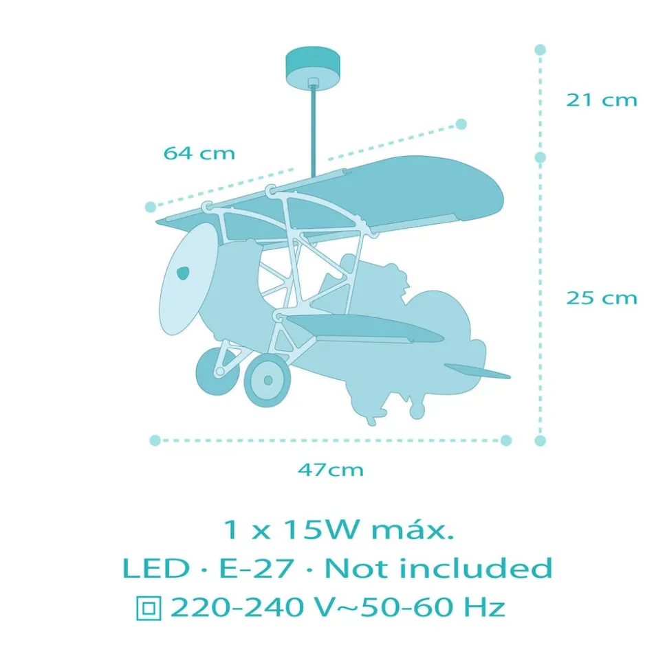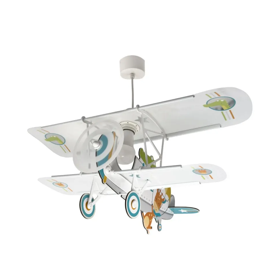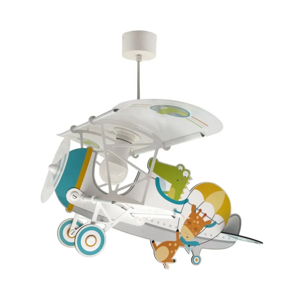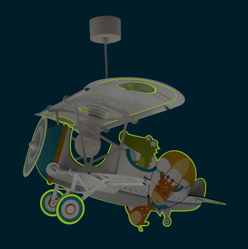 Kleurrijke hanglamp met krokodillenvliegtuig voor heel jonge piloten Veel kinderen ambiëren een droombaan – zoals piloot. Deze hanglamp in een speels vliegtuigontwerp kan de interesses van heel jonge kinderen aanspreken. Het is een visuele attractie die hun voorkeuren naar voren brengt en het enthousiasme van kinderen stimuleert met liefdevol ontworpen details. Het kleurrijke model is zeer opvallend en heeft een vliegtuigmotief met een krokodillenpiloot en een giraffe met een parachute. De structuur is gemaakt van MDF-hout, met ABS-kunststof en vleugels van brandvertragend polypropyleen. Als bijzonderheid is fluorescerend materiaal gebruikt zodat de Crocodile Plane hanglamp nog 10 tot 15 minuten discreet blijft schijnen nadat de lamp is uitgeschakeld. De lamp wordt vervaardigd in Spanje.