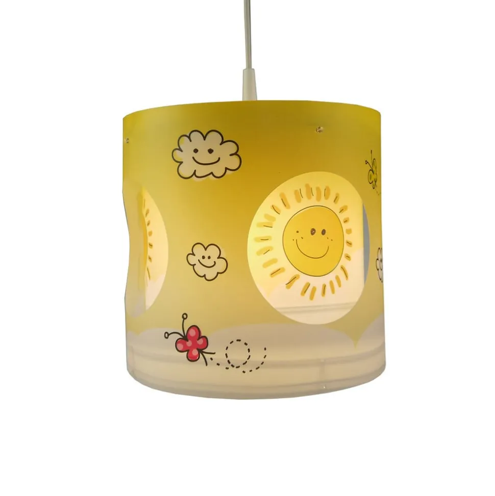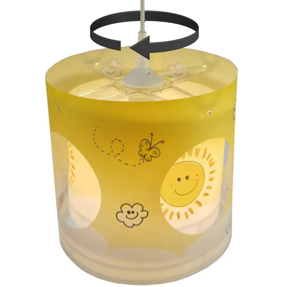 De zonnige gele Sunny hanglamp brengt beweging in de kinderkamer. De buitenschaduw is versierd met kleine vlinders en mooie weerswolken en heeft rondom vier ronde uitsparingen. De iets kleinere binnenschaduw is versierd met lachende zonnetjes. De binnenste kap wordt aangedreven door een stille motor op zonne-energie, de energie voor de zonnemodule komt van de lichtbron. De binnenschaduw draait geruisloos, zodat lachende zonnen steeds weer door de ronde openingen van de buitenschaduw schijnen. Sunny is een kinderkamerlamp die elk kind zal inspireren – made in Germany.