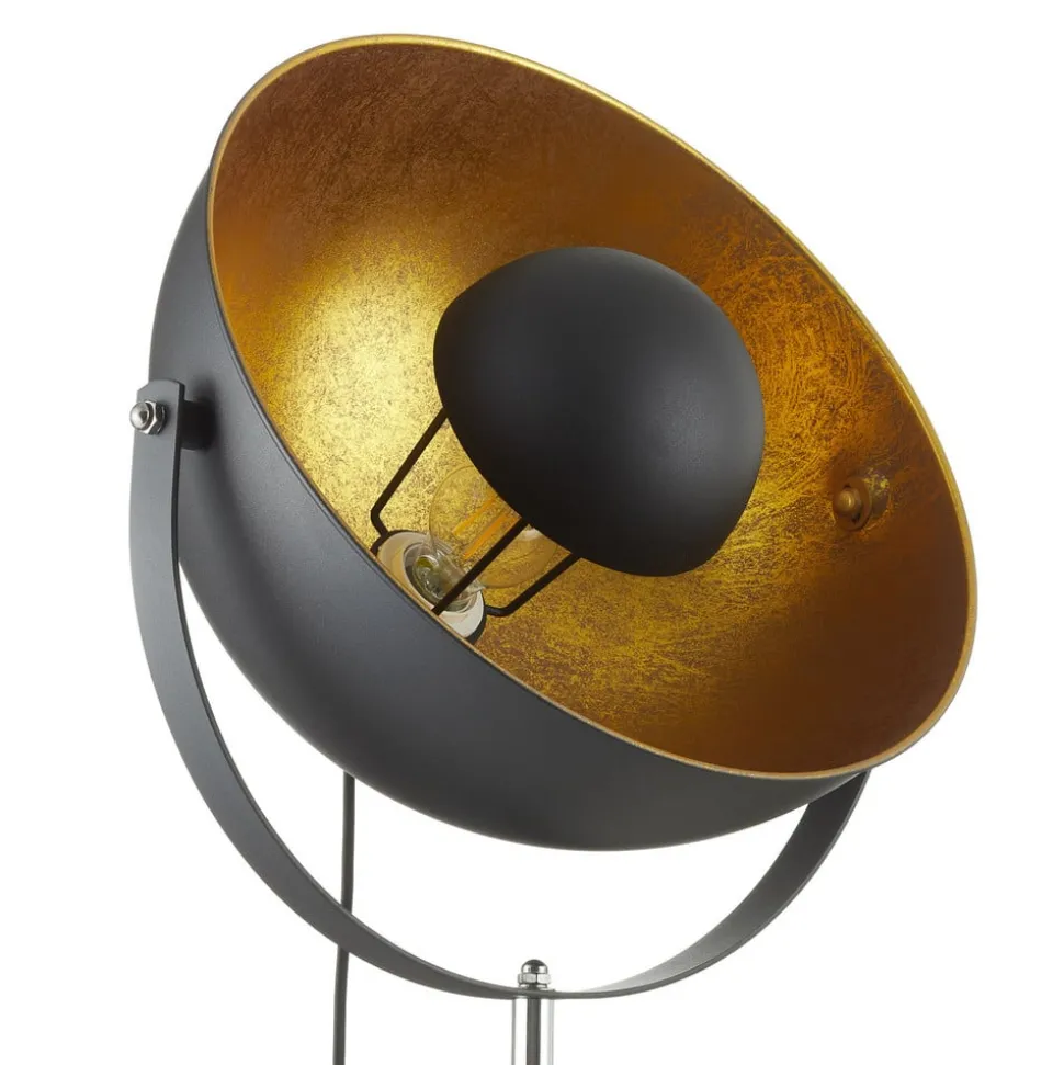 Vloerlamp Lenn met drie poten en een krachtige zwart-gouden look.