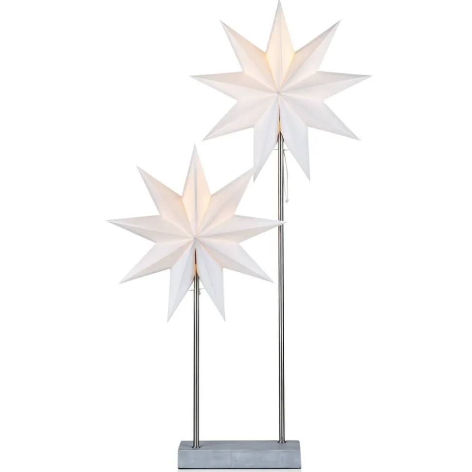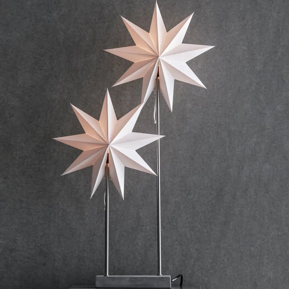 Met Noorse charme uitgerust, fascineert de decoratieve lamp Duva: Haar voet bestaat uit grijs marmer, het frame bestaat uit twee metalen stangen van verschillende hoogte met E14 fitting, op elk daarvan troont een negenpuntige ster gemaakt van wit papier. Als lampen worden maximaal 25 Watt sterke gloeilampen gebruikt, waarvan de gloed zachtjes door het papier schemert. De totale hoogte van de lamp Duva is 80 cm. Dankzij haar discrete schoonheid harmonieert ze met de meest uiteenlopende interieurstijlen en zendt in elke kamer een feestelijk oplichtende glans. De lampen zijn niet in de levering inbegrepen, ze zijn afzonderlijk via de accessoires bestelbaar.