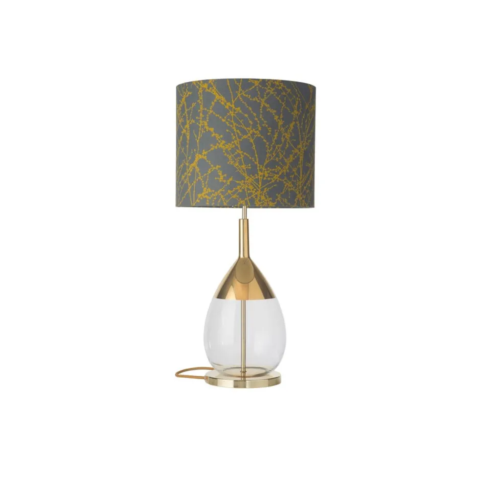 De tafellamp Lute scoort met haar modieuze design en overtuigt met het bolvormige glazen lichaam en de hoogwaardige textielen kap. De voet van mondgeblazen glas is chic gecombineerd met goudkleurige metalen onderdelen. De lampenkap van linnen, met een tijdloze versiering van okerkleurige takken, past bij de kleur. Het vormt door zijn donkere kleur een aantrekkelijk contrast met het heldere glas en zorgt voor een diffuus licht, dat zeer aangenaam wordt waargenomen.