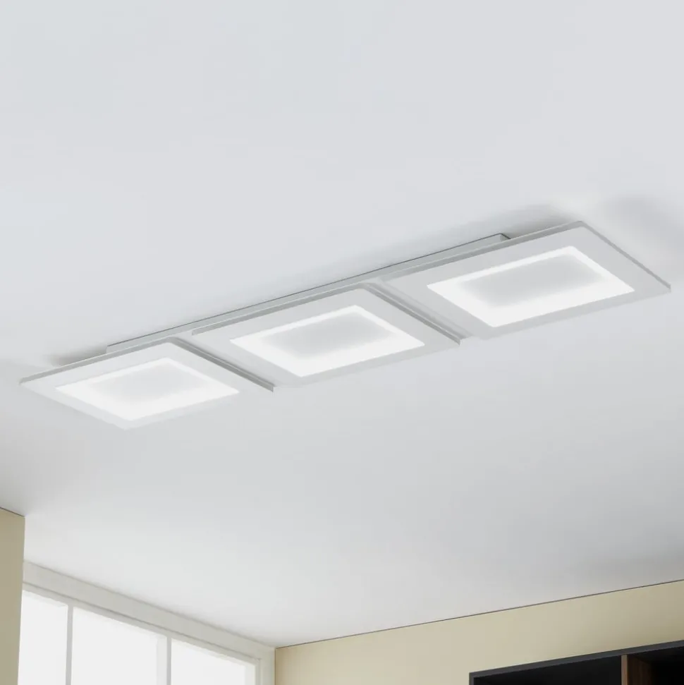 LED plafondlamp Padrogiano-Z EGLO connect, 3-lamps, rechthoekig De rechthoekige LED plafondlamp Padrogiano-Z uit de connect.Z smart home serie is gemaakt van wit metaal en drie witte kunststof vierkanten. De LED’s die zijn geïntegreerd in de binnenste ringen en aan de buitenranden van de drie vierkanten zorgen voor aangenaam licht naar wens. Het licht in de vierkanten kan worden gevarieerd tussen warmwit, universeel wit en daglichtwit licht, terwijl het licht van de LED’s die zijn ingebouwd in de randen van de vierkanten een verscheidenheid aan RGB lichtkleuren biedt. Zowel de buitenste als de binnenste ringen kunnen afzonderlijk worden in- en uitgeschakeld en gedimd. De Padrogiano-Z plafondlamp wordt bediend via een gratis app (AwoX Home Control), die ook toegang biedt tot andere handige functies zoals dimmer, timer, aanwezigheidssimulatie en nog veel meer. Het LED paneel wordt bediend via Bluetooth en ZigBee 3.0 en kan ook worden bediend via compatibele spraakassistenten. Een alternatieve vorm van bediening is een afstandsbediening die verkrijgbaar is als accessoire. De plafondlamp past in verschillende interieurstijlen en biedt zeer flexibele en sfeervolle verlichting in een groot aantal kamers.