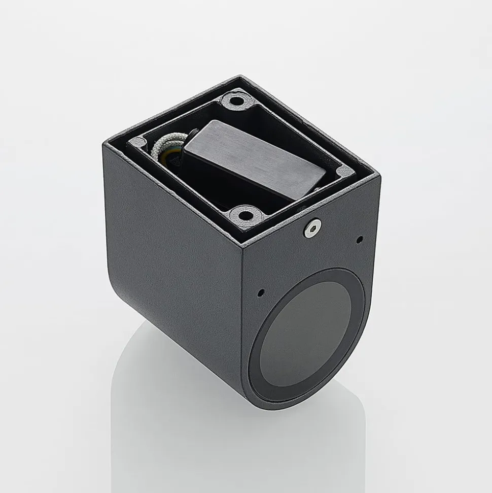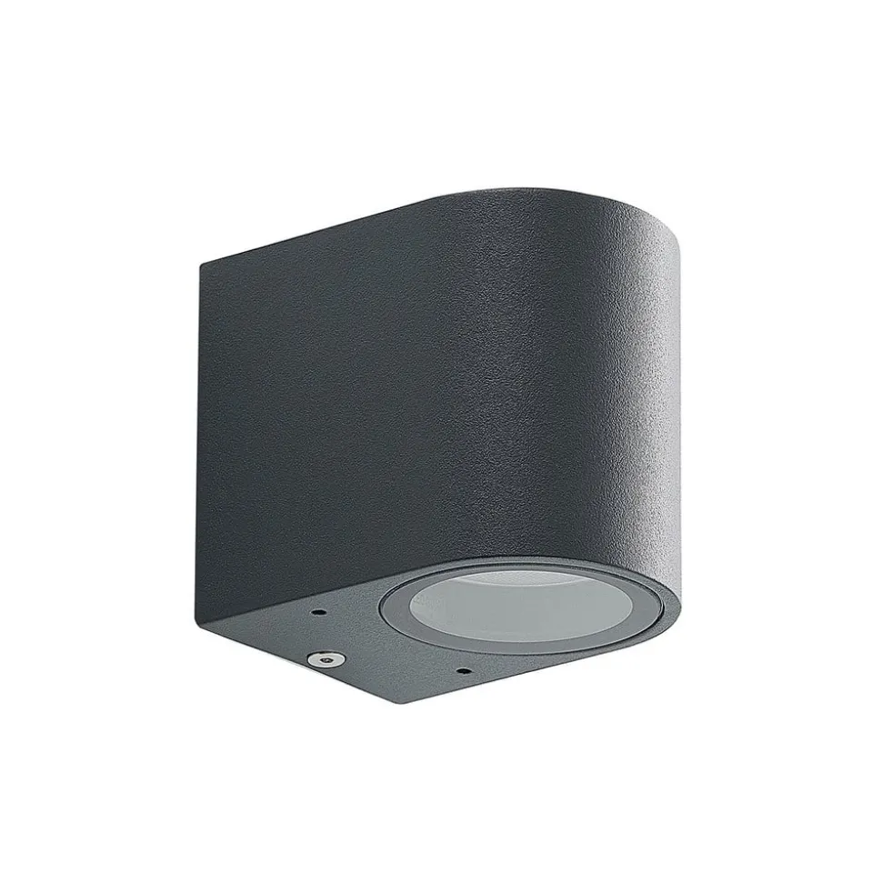Donkergrijze buitenwandlamp Fijona in halfronde vorm, voor GU10, IP44 Fijona is een eenvoudige buitenwandlamp met een tijdloze look die een halfronde armatuur heeft van gegoten aluminium met een donkergrijze afwerking die heel goed past in veel omgevingen. Je kunt een slim oriëntatiepunt creëren op de gevel van je huis, zodat je veilig rond het huis en op het erf kunt lopen, zelfs als het al donker is geworden.