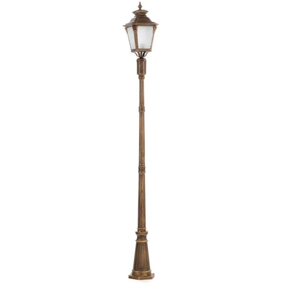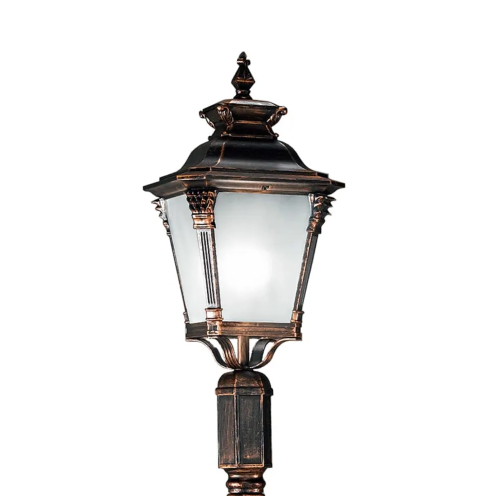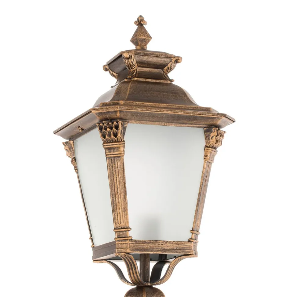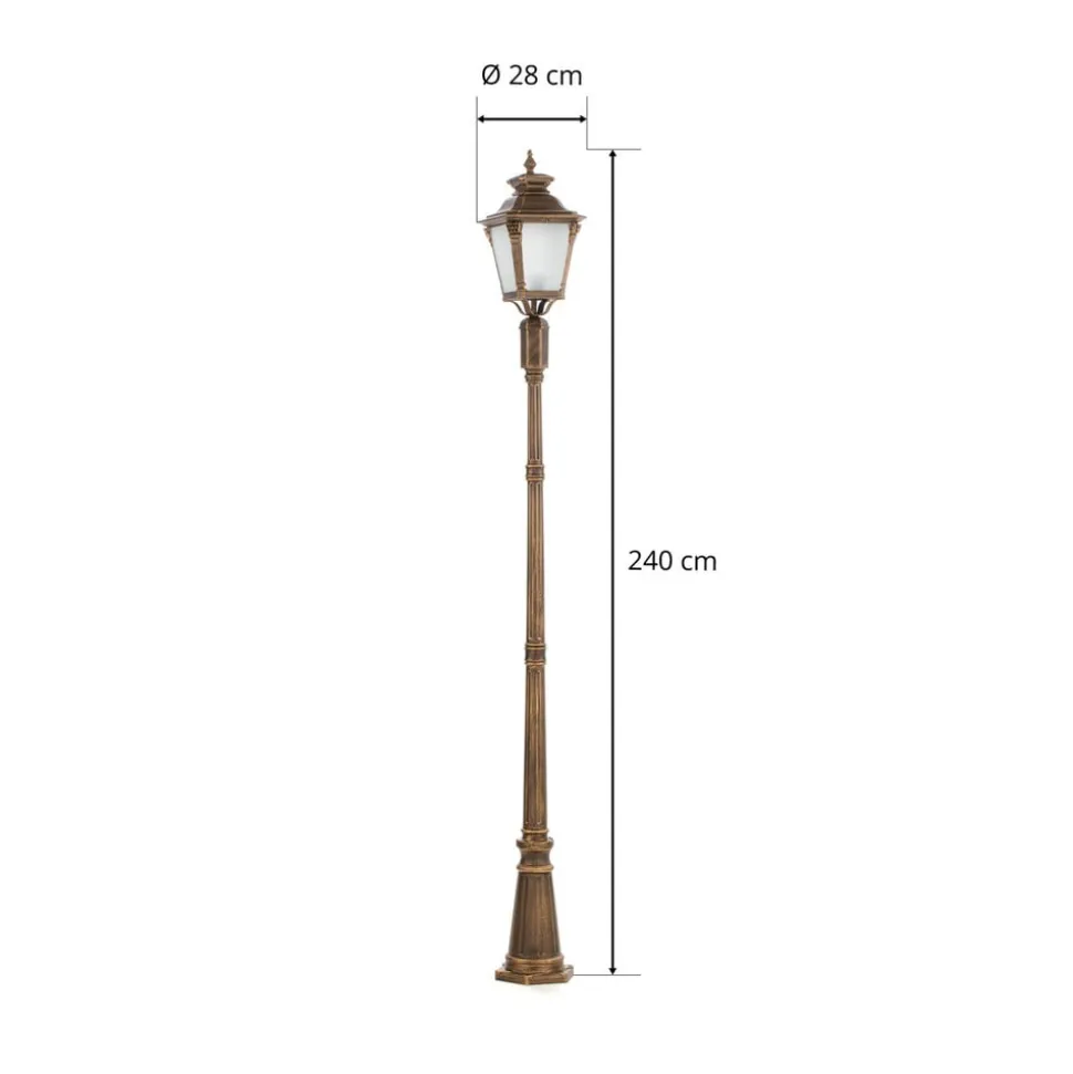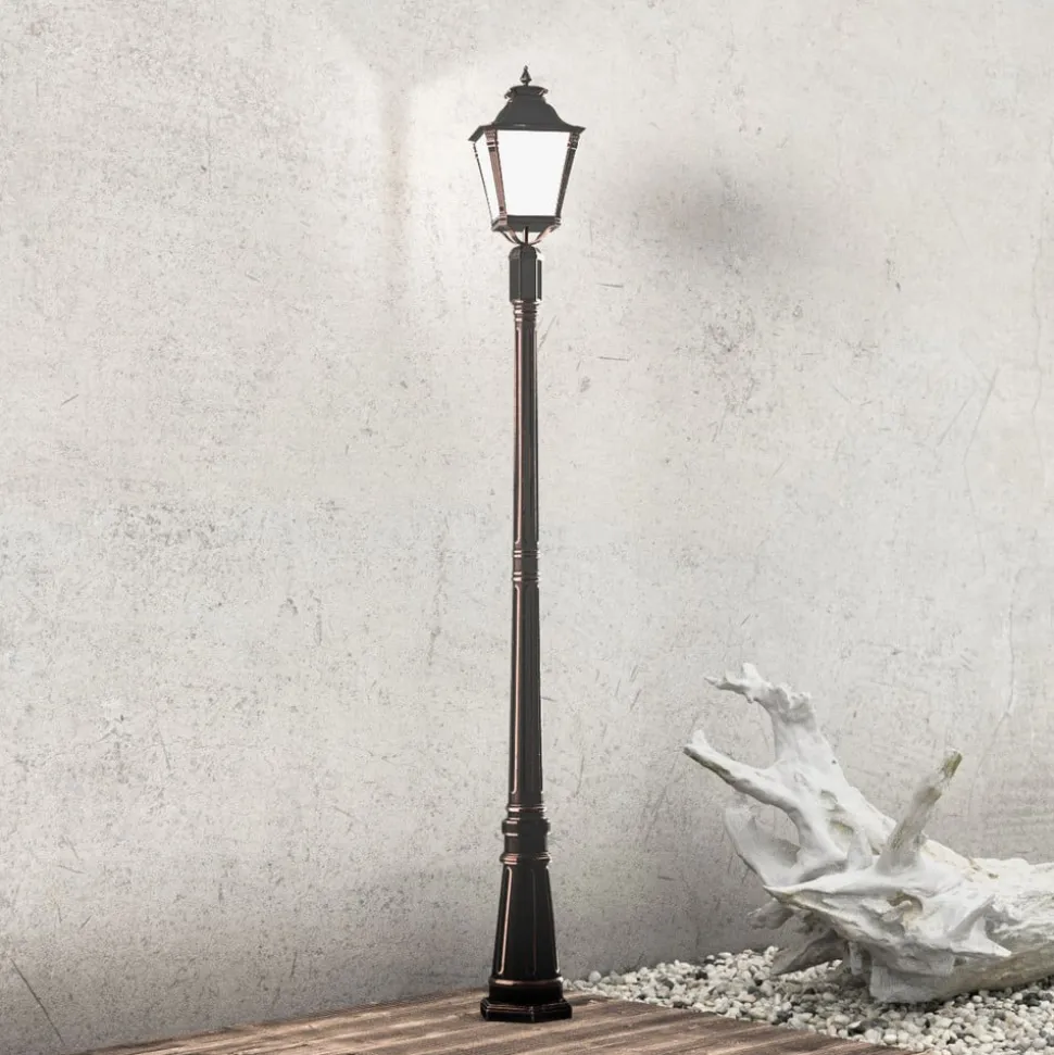 Staande lamp Aiko – gedetailleerde lantaarn-look armatuur Met een gedetailleerde en antiek ogende buitenkant overtuigt deze armatuur voor buiten. Door haar uiterlijk, het samenspel van gesatineerde glasruiten en een authentiek, antiek frame is deze armatuur een prachtige lichtbron. Het licht verliest zijn verblinding doordat het zachter naar buiten schijnt door de gesatineerde ruiten. Deze Aiko lamp nodigt uit tot dromen en fantaseren.