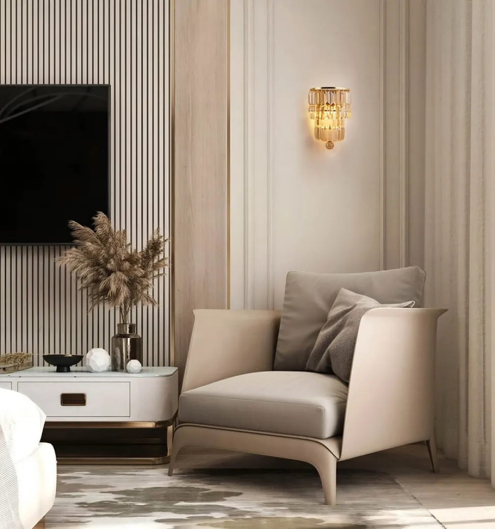 Empire wandlamp met kristallen cascades De Empire wandlamp brengt oogverblindende verlichting en glamour in elke kamer, inclusief badkamers dankzij de beschermingsgraad IP44. Een glanzend metalen frame is voorzien van glinsterende, prachtig geslepen glazen hangers die in een cascade zijn gerangschikt, met als hoogtepunt een adembenemende kristallen hanger. De twee lampen (niet inbegrepen) verlichten de kristallen prachtig en zorgen voor een vleugje glamoureuze elegantie. Dit veelzijdige stuk zal een vleugje glans toevoegen aan elke slaapkamer, woonkamer, eethoek of hal.