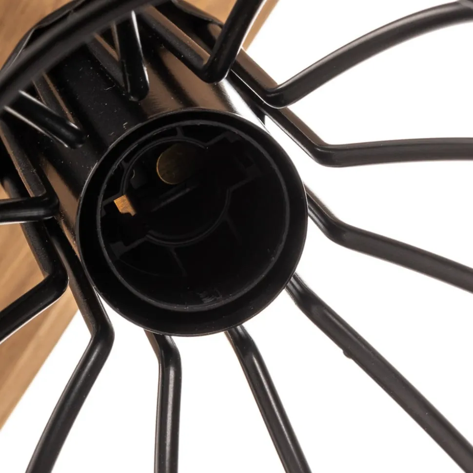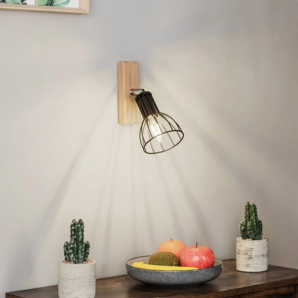 Aria wandlamp met eikenhouten houder en ronde kooikap Aria is een moderne wandlamp die een natuurlijk accent in de kamer legt. De kooikap van zwarte metalen stutten vormt ook de perfecte basis voor een decoratieve lichtbron, die direct zichtbaar is door de open voorkant van de kap en de open ruimtes aan de zijkanten. Een rechthoekig element van lichtgekleurd, geolied eikenhout dient als muurbeugel. Dankzij een scharnier op de kapbevestiging kan deze rondom worden georiënteerd – Armatuur van het merk Envostar – Made in Europe – Duurzame verpakking van recyclebare materialen
