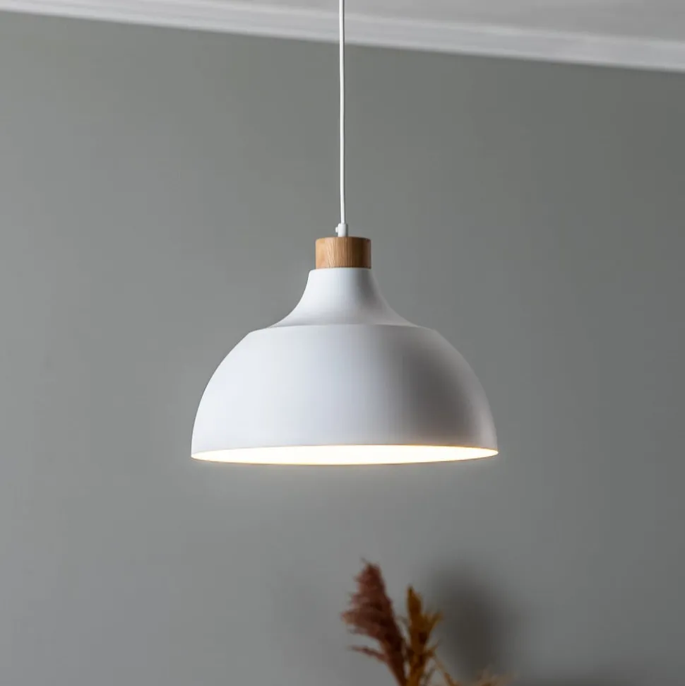 1-lamp Kaitt hanglamp met ronde stalen kap in wit en lichtgekleurd houten detail Die combinatie van rond, harmonieus design en natuurlijke details maken de Kaitt hanglamp een tijdloze lichtbron met een Scandinavische Touch. De stalen kap heeft een witte afwerking en is open aan de onderkant zodat een tafel, aanrecht of kamer direct verlicht wordt. Die Kaitt hanglamp is een product van het merk Envostar en wordt geproduceerd in Europa. Die minimaliseert de transportroutes en CO2-uitstoot. Die verpakking van de lamp is ook duurzaam – wegwerpmaterialen zoals plastic, polystyreen en plasticfolie worden vermeden.