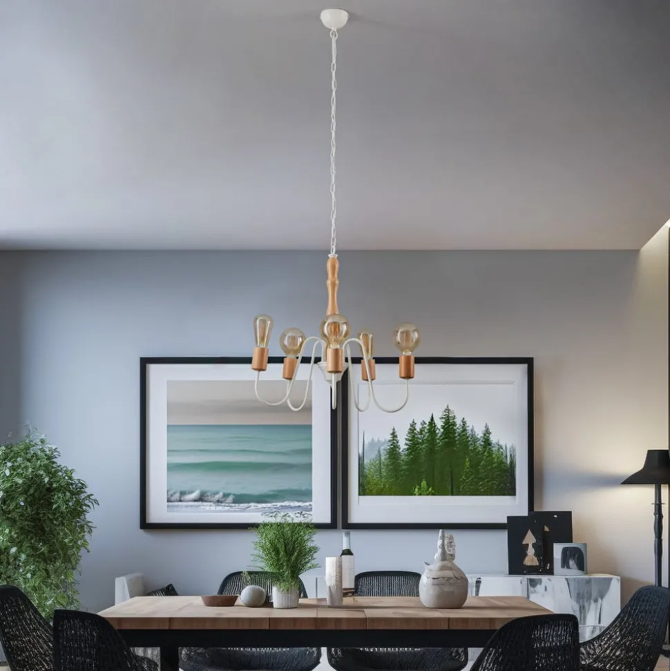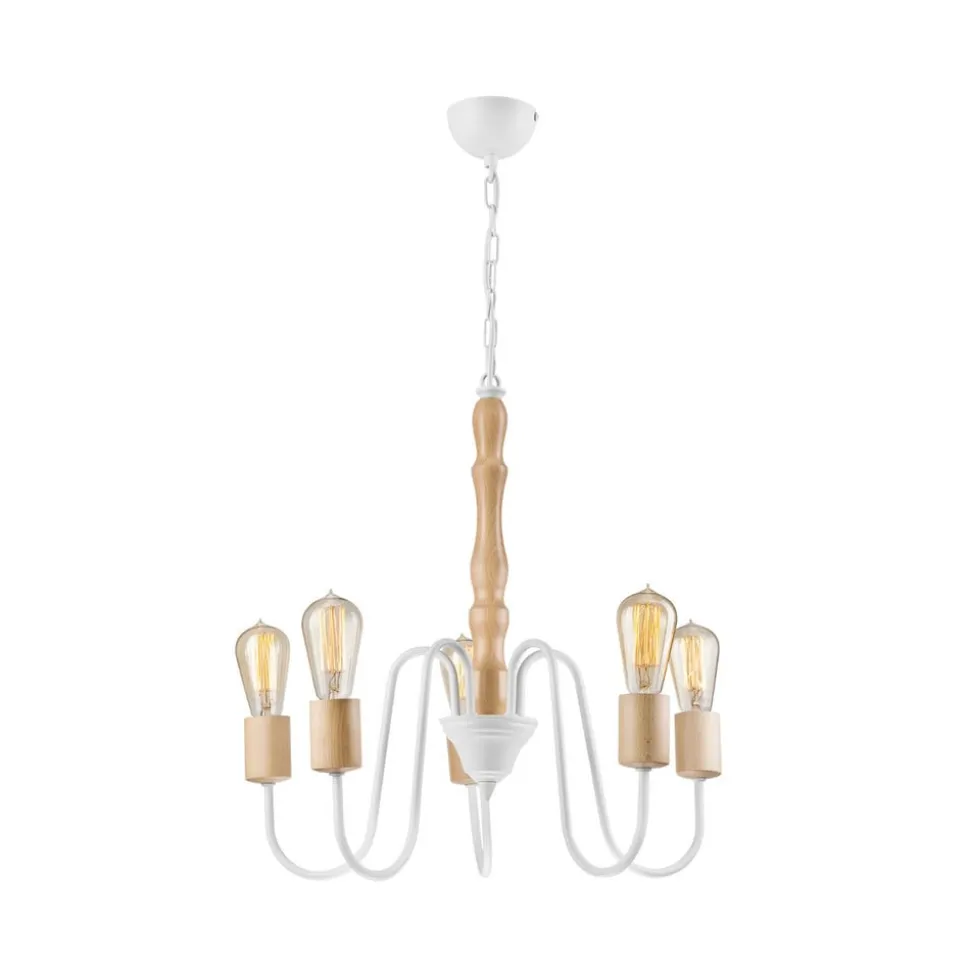 De Envostar Joiy kroonluchter, 5-lamps, combineert modern design met natuurlijke materialen en creëert zo een fascinerende verlichtingssfeer. Deze kroonluchter is gemaakt van ijzer en hout en brengt een harmonieuze combinatie van industriële charme en natuurlijke warmte in elke ruimte. De witte en lichte houtlook past naadloos in verschillende interieurstijlen en zorgt voor stijlvolle verlichting in de woonkamer, hal of eetkamer.