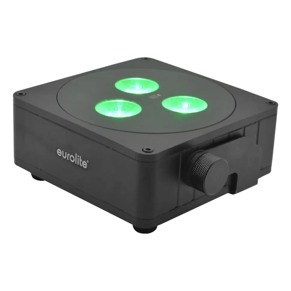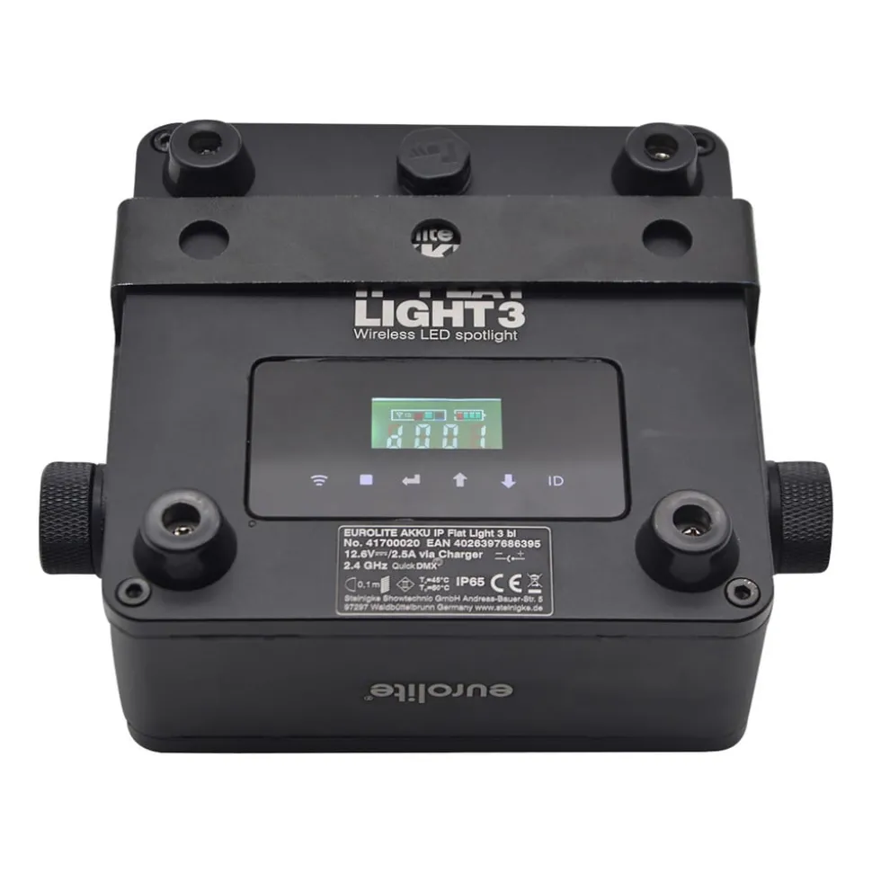 EUROLITE oplaadbare platte lamp 3 LED spot IP65 met afstandsbediening De oplaadbare platte LED spot 3 is dankzij beschermingsgraad IP65 ook geschikt voor buitengebruik. Hij is draadloos, flexibel en veelzijdig en uitgerust met drie RGBW LED’s van 8 W. Dankzij de geïntegreerde oplaadbare batterij verlicht hij podia, theaters, bars en andere ruimtes tot 16 uur lang (afhankelijk van het gebruikte programma) en wordt hij binnen 4 uur opgeladen met de meegeleverde oplader. Met de beugel op de spot kan de kantelhoek handmatig worden aangepast.