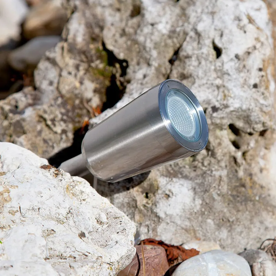 - de armatuur kan direct op de grond worden gemonteerd met de roestvrijstalen standaard of worden gebruikt met de bijgeleverde aardspies