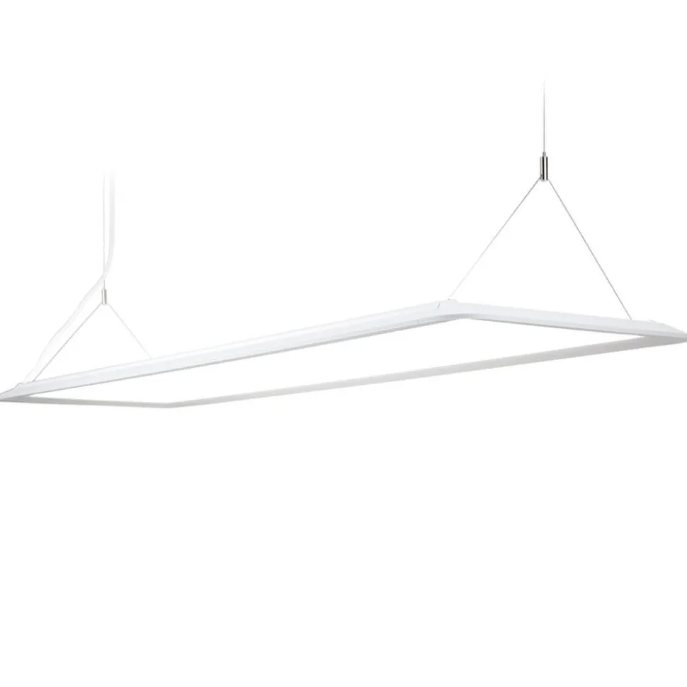 RECHTECK LED hanglamp Appareo voor universeel wit kantoor- en algemene verlichting – Dali dimbaar Die LED hanglamp Appareo is ontworpen als een eenvoudige, afgeronde rechthoek met een behuizing van plaatstaal en aluminium. Het licht wordt zijdelings in de diffuser van prismatisch acryl geleid (lijkt transparant in uitgeschakelde toestand) en straalt 60 % naar beneden en 40 % naar boven uit. Het resultaat is indirecte en directe werkverlichting die ook geschikt is voor beeldschermwerkplekken dankzij een goede verblindingsbescherming (UGR < 19). De witte baldakijn van kunststof is geschikt voor schroefmontage aan het plafond of voor plaatsing in holle plafonds – in de baldakijn geïntegreerde Konverter – extern Dali dimbaar – met dubbele afhanghoogte; kan tijdens de installatie worden ingekort – afstand tussen de montagepunten voor de afhanghoogte: 110,6 cm – kant-en-klaar geleverd voor aansluiting op het lichtnet