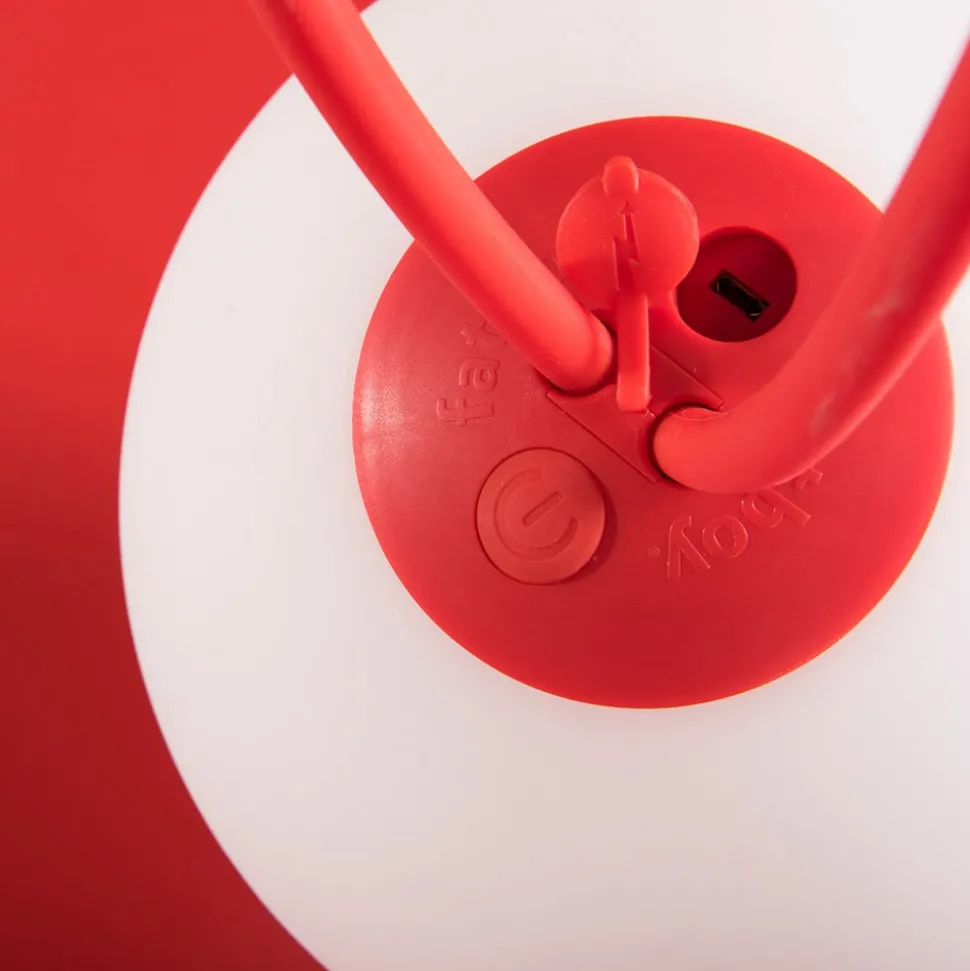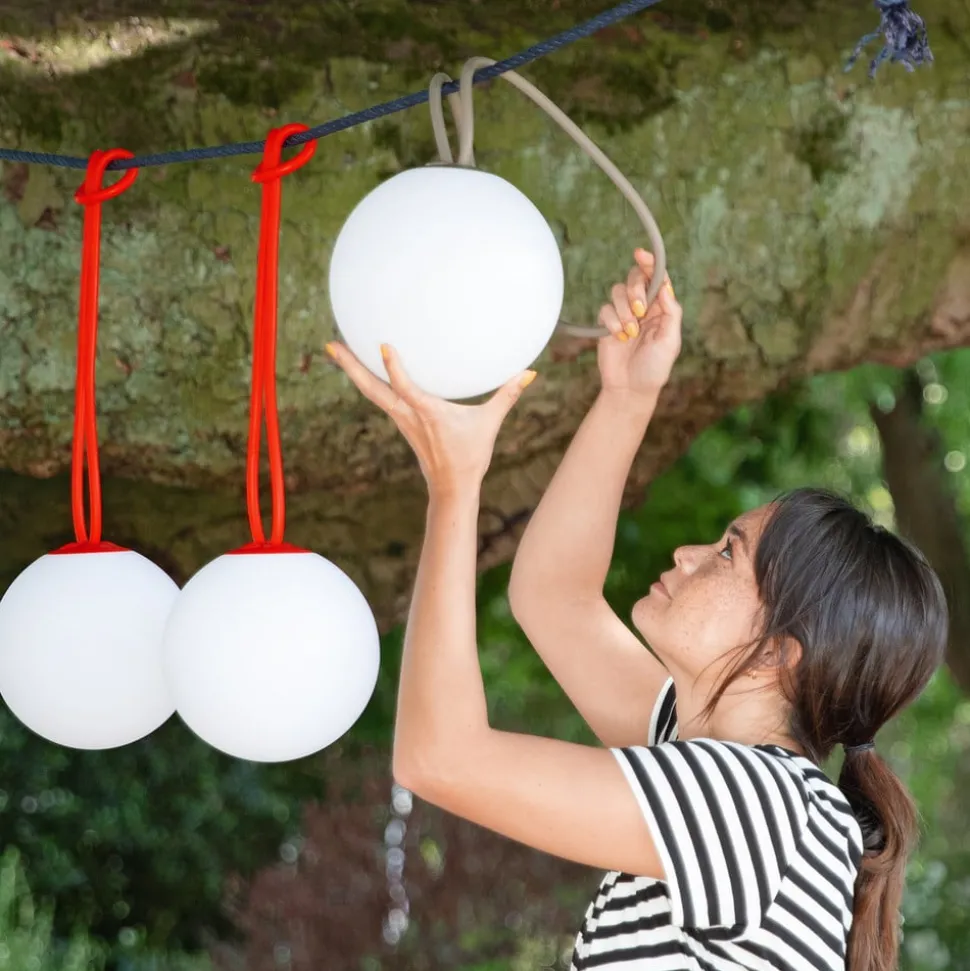 Bolleke snoerloze LED hanglamp voor buiten De Bolleke LED hanglamp voor buiten in de vorm van een bol met een eenvoudig ophangsysteem is een stijlvolle, opvallende en nogal ongewone metgezel. De kleurrijke, creatieve siliconen lus is zo ontworpen dat de bol er precies doorheen past. Dankzij de geïntegreerde oplaadbare batterij kan de bollamp nog flexibeler worden gebruikt. De batterij is heel eenvoudig op te laden met de meegeleverde USB-kabel. De opening hiervoor is geïntegreerd in de bovenste bevestiging van de bol. De schakelaar voor het in- en uitschakelen van de lamp zit er ook tegenover. Lichtstanden kunnen ook worden ingesteld door meerdere keren op de schakelaar te drukken. Je kunt kiezen uit drie verschillende lichtstanden (helderheidsniveaus), zodat je de ideale sfeer kunt creëren. De geraffineerde en eenvoudige vorm van de hanglamp is typerend voor Fatboy-creaties, net als het ontwerp en de interessante, praktische technologie. De ronde diffuser met opalen buitenoppervlak geeft een zacht en gelijkmatig licht in alle richtingen. Hij is ideaal beschermd voor buitengebruik dankzij IP55. De buitenkant is volledig van kunststof, terwijl de binnenkant is voorzien van een aluminium basisplaat en LED-behuizing. De gekleurde lus is gemaakt van siliconenrubber. Ontwerpster Nathalie Schellekens richtte in 2006 de ontwerpstudio Studio ONS op. Ze besteedt veel aandacht aan gebruiksvriendelijkheid, details en tijdloos design. Natuur, gewoontes en vormen spelen een grote rol in het ontwerp van producten die iconen moeten worden. Ze creëerde ook een lamp voor het internationaal bekende merk Fatboy, die al snel een bestseller werd.