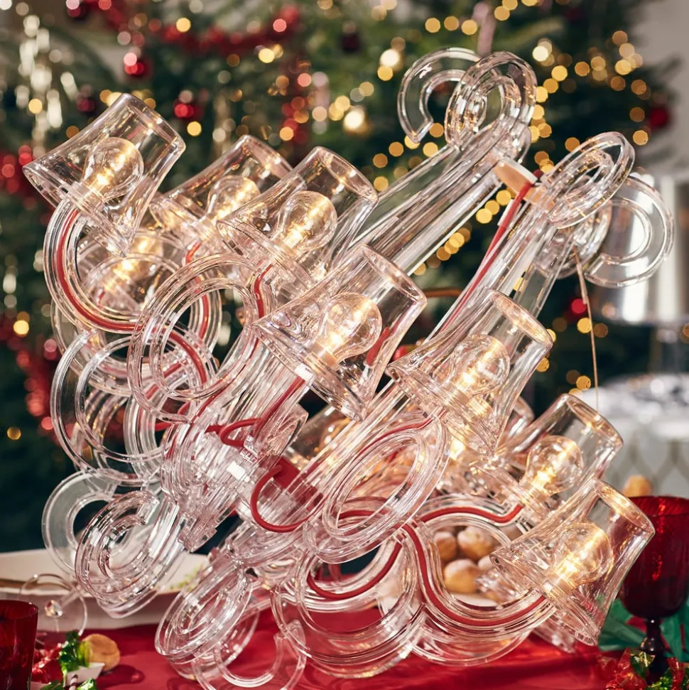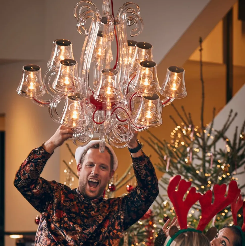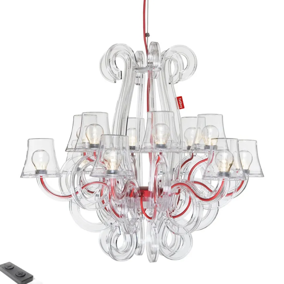 De LED kroonluchter Rockcoco 12.0 ziet er cool uit en is een bijzondere, moderne interpretatie van de bekende kroonluchter. Hier ontmoet klassiek hedendaags en brengt een gevoel van glamour en rock’n roll. De typische transparante Fatboy-look geeft u een blik op de technologie. In het oog springende rode kabels slingeren door de gebogen armen van de kroonluchter, aan de uiteinden waarvan de LED-lichtbron zich bevindt onder een kleine kap waarvan de vorm een gloeilamp imiteert.