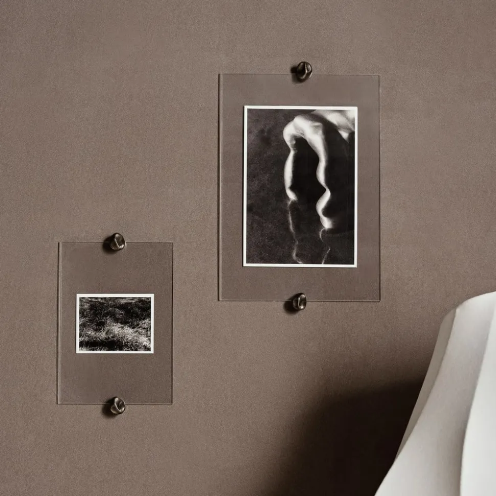 Gravel fotolijst van acryl en messing Met de Gravel fotolijst voeg je een vleugje verfijning en persoonlijke flair toe aan je woonruimte. Deze elegante, moderne lijst bestaat uit twee acrylpanelen die naadloos met elkaar verbonden zijn door sculpturale beugels van gegoten messing, die doen denken aan kleine steentjes. Om de foto van je keuze op te hangen, bevestig je gewoon de twee messing beugels aan de muur. Vervolgens plaats je het schilderij tussen de twee acrylpanelen en zet je het vast door de gegoten koperen kapjes op de beugels te bevestigen. Je foto is nu veilig en elegant ingelijst. Onderhoudsinstructies: afnemen met een droge doek.