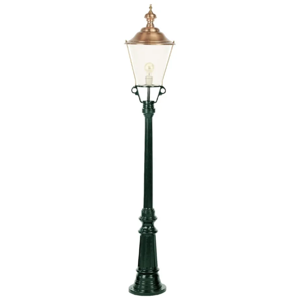 Aantrekkelijke lantaarnpaal Flores met koperen decoratie Deze lantaarnpaal maakt indruk met zijn indrukwekkende hoogte en klassieke ontwerp, waardoor de lamp een zeer stijlvolle en elegante uitstraling heeft. De decoratieve koperen kap is bijzonder opvallend en versterkt het ontwerp. De lantaarnpaal kan worden gebruikt om meer veiligheid te bieden en tegelijkertijd de buitenruimte smaakvol te decoreren. Installatievoorschrift: De lamp wordt rechtstreeks op de fitting aangesloten. We raden aan om de installatie te laten uitvoeren door een gekwalificeerde elektricien. De fabrikant raadt aan om hiervoor rubberen kabels te gebruiken